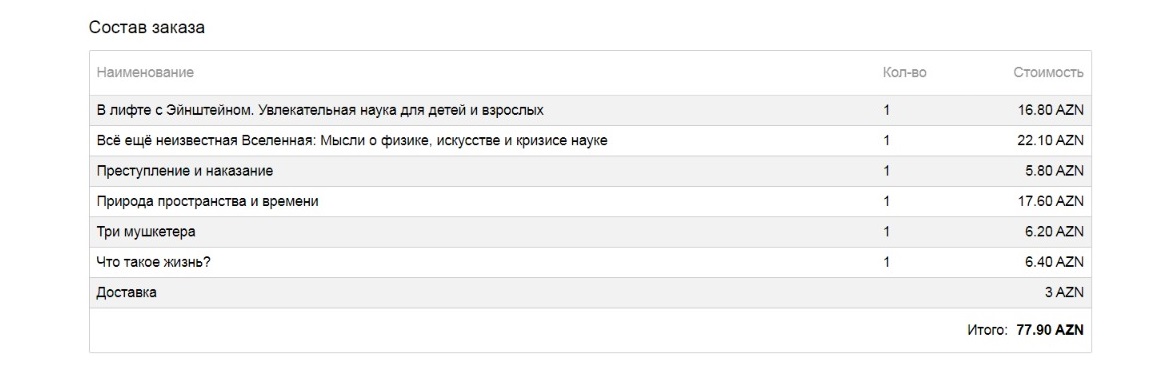 Kitab almaq qərarına gəldikdən sonra, siz onu Bakının istənilən yerindən sifariş edə bilərsiniz, kuryer aldığınız malı göstərilən ünvana qısa zamanda çatdıracaq. Sifariş etmək üçün, sizin kitabı seçib “Tıkla al” düyməsinə basmağınız yetərlidir. Bu cür alış-verişin üstünlüyü – evdən vəya iş yerinizdən ayrılmadan, isdəyiniz kitabı tapmaqda vaxt itirmədən əldə etməkdir.