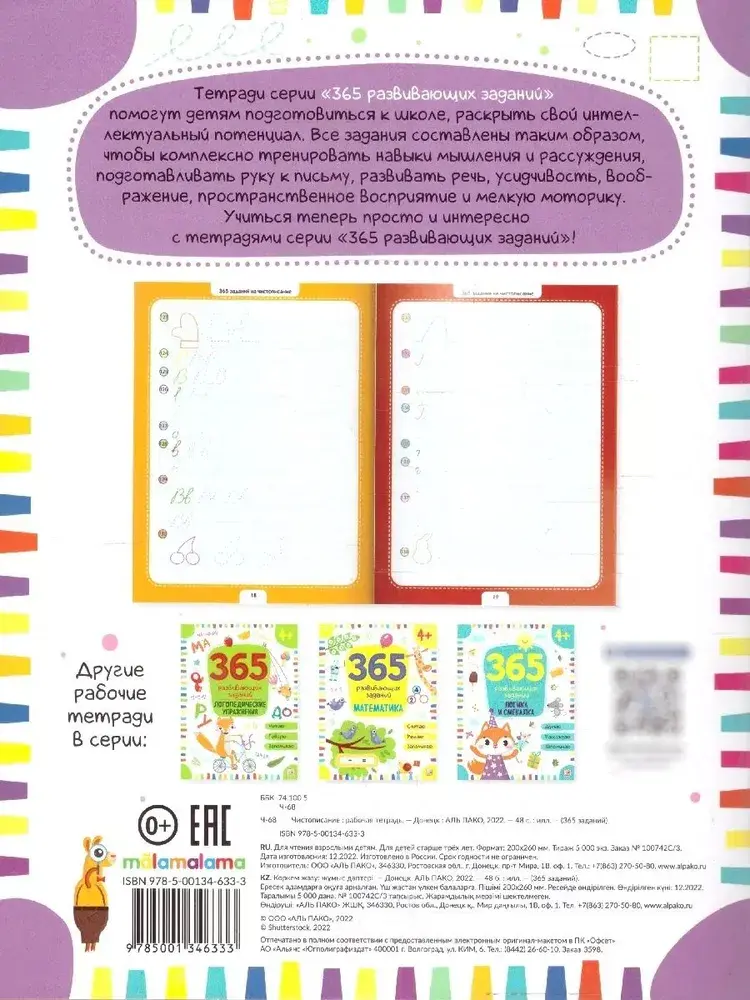 Рабочая тетрадь «Чистописание» из серии «365 развивающих заданий» - это комплексная подготовка к школе для самых любознательных малышей. Ровно 365 заданий, которые помогут ребенку развить мелкую моторику рук, освоить первые элементы будущего письма, научиться уверенно держать ручку и не бояться вести четкую линию. Мы специально работали над структурой и оформлением тетради: задания чередуются по сложности и смыслу, страницы оформлены в ярких привлекательных цветах. Мы сделали все, чтобы ваш ребенок с удовольствием познавал мир, готовился к школе и развивался. Он будет с радостью возвращаться к занятиям снова!
