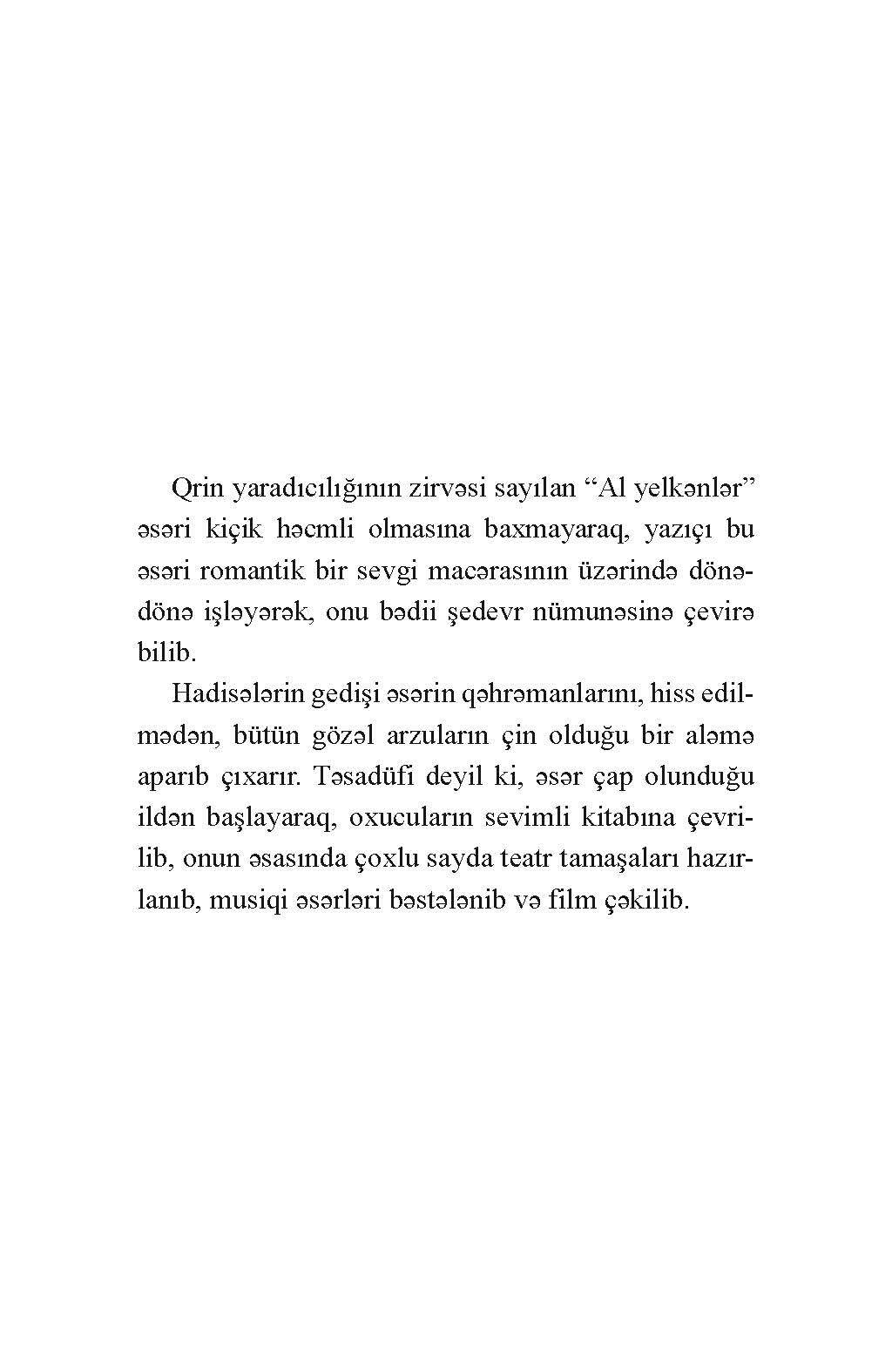 Qrin yaradıcılığının zirvəsi sayılan “Al yelkənlər” əsəri kiçik həcmli olmasına baxmayaraq, yazıçı bu əsəri romantik bir sevgi macərasının üzərində dönə-dönə işləyərək, onu bədii şedevr nümunəsinə çevirə bilib.