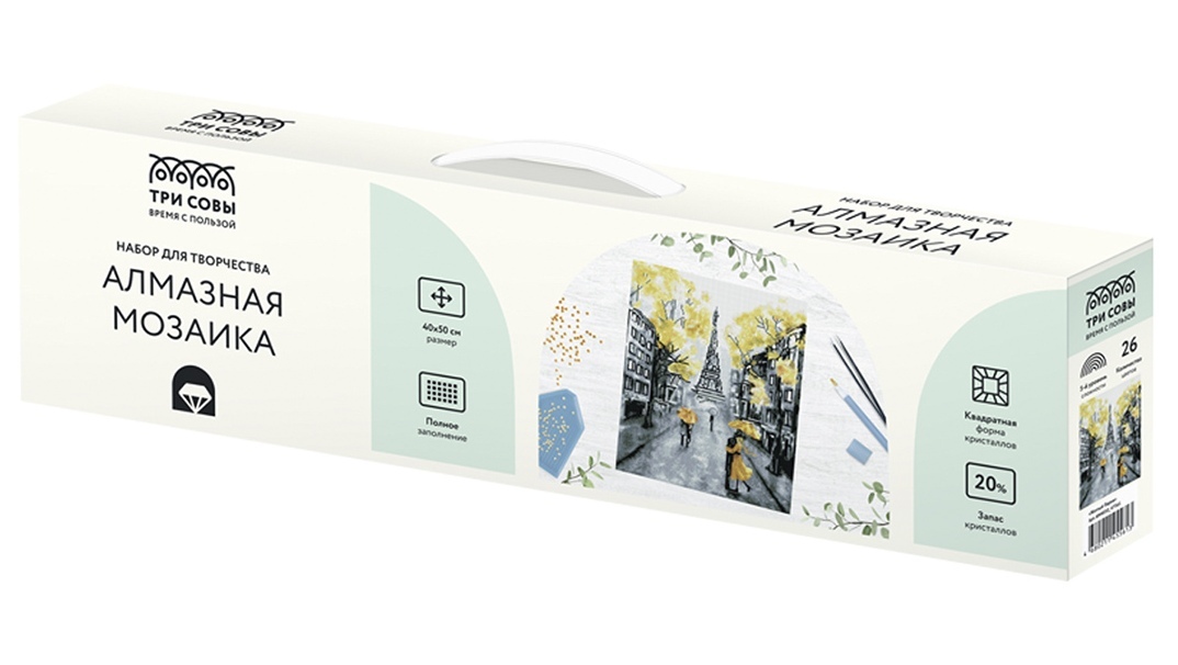 Алмазная мозаика ТРИ СОВЫ "Желтый Париж", 40*50см, холст, картонная коробка с пластиковой ручкой. Создание картины из алмазной мозаики «ТРИ СОВЫ» – увлекательное занятие, которое дарит умиротворение и гармонию, развивает усидчивость, аккуратность и внимательность. Вы сможете создать своими руками оригинальную, мерцающую на свету картину.