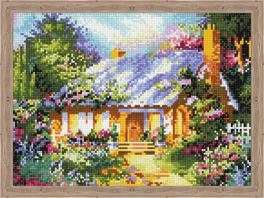 Алмазная вышивка "Сказочный дом среди цветов", 30х40 см Цветной, цвет мультиколор Набор для создания мозаичной картины. Полная выкладка. В набор входит коробка с ручкой, синтетическая основа типа "баннер" с принтом и клеевым слоем на деревянном подрамнике, с подложкой из картона, лист со схемой выкладки, лоток для страз, пластиковый пинцет, пластиковый карандаш, клей-липучка, мозаика акриловая с алмазной огранкой, зип-пакеты, книжка инструкция.