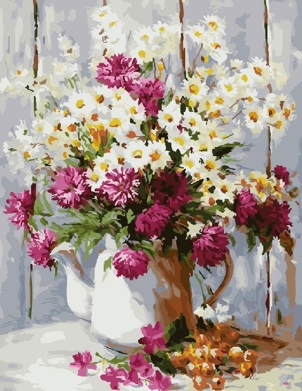 Холст, сделанный из чистого хлопка на подрамнике Набор акриловых красок,индивидуально разлитый для каждой картины Набор кистей Крепеж для подвешивания картины Контрольный лист -схема Размер:40*50 Уровень сложности:*** Количество цветов:30