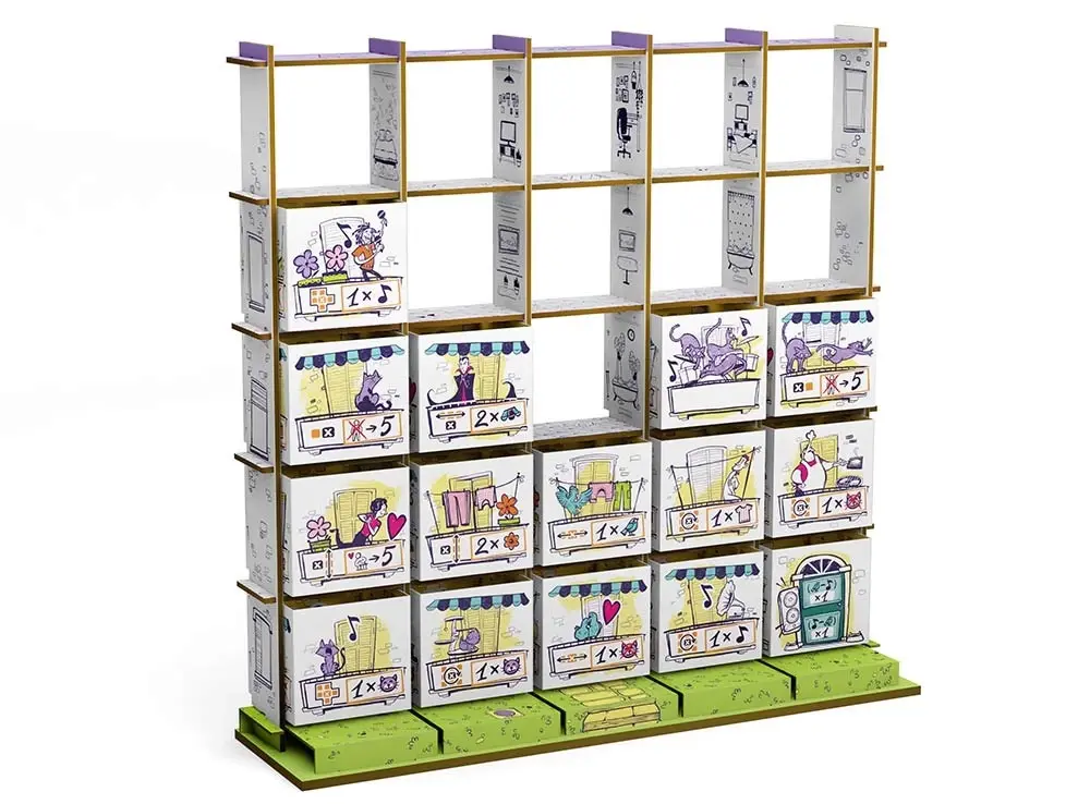 Стройте жилой дом, вставляя кубики-балконы в рамку размером 5×5 клеток, по одному за ход. В каждом раунде один из игроков выбирает, какие стороны достанутся ему, а какие — сопернику, но решение о том, куда именно поставить кубик, принимает уже оппонент. Постарайтесь размещать кубики таким образом, чтобы выполнить условия, указанные на балконах, обращённых к вам. Кто наберёт больше очков к концу партии?