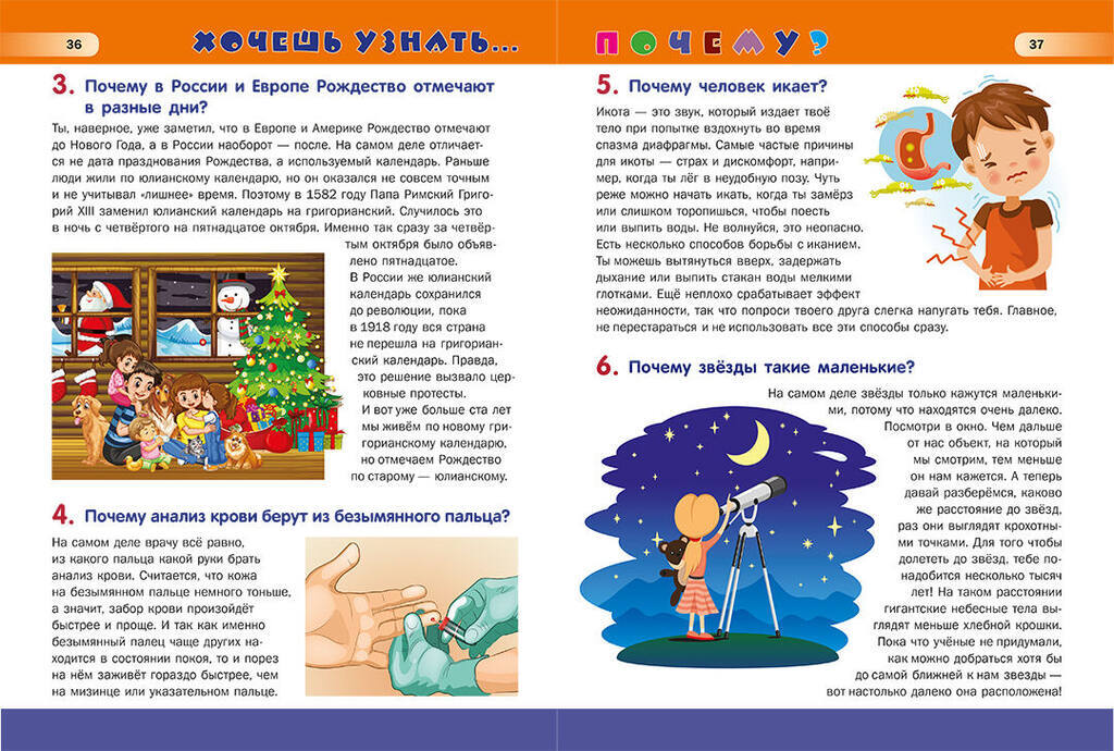Уважаемые родители! Наша энциклопедия поможет вам найти ответы на бесконечные вопросы вашего любознательного ребёнка: - Что видят космонавты из космоса? - Зачем муха потирает лапки? - Когда изобрели математику? - Куда пропали все динозавры? - Кто придумал конструктор "Лего"? - Откуда берётся град? - Какое здание самое высокое в мире? - Почему листья осенью желтеют? - Как изобрели колесо? - Где делают самое вкусное мороженое? - Что такое вулкан? - Сколько воды пьёт верблюд? - Для чего вертолёту пропеллер? Краткие ответы будут понятны любому ребёнку, а яркие иллюстрации сделают чтение для маленького эрудита ещё более интересным.