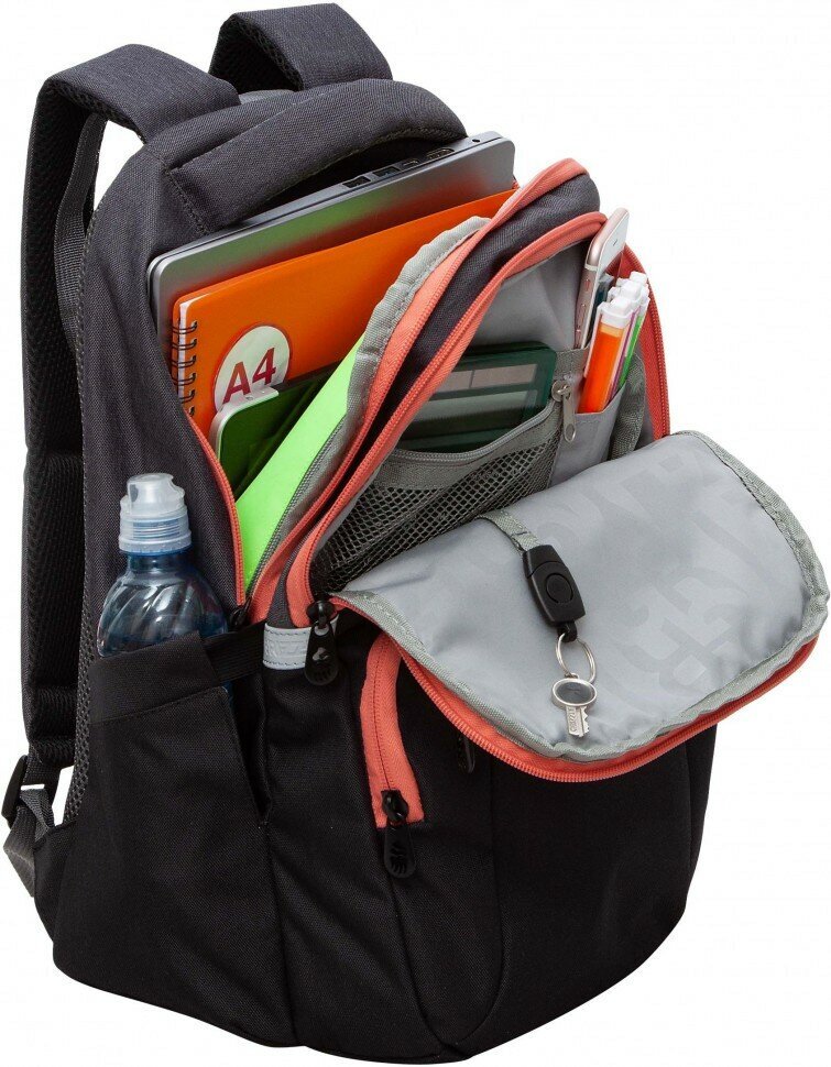 Внутри 5 карманов, включая карман для ноутбука 15”, пенал и брелок для ключей.
