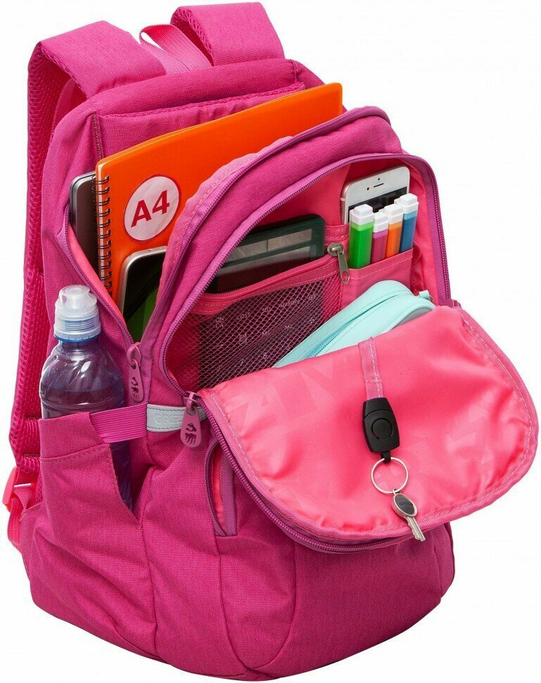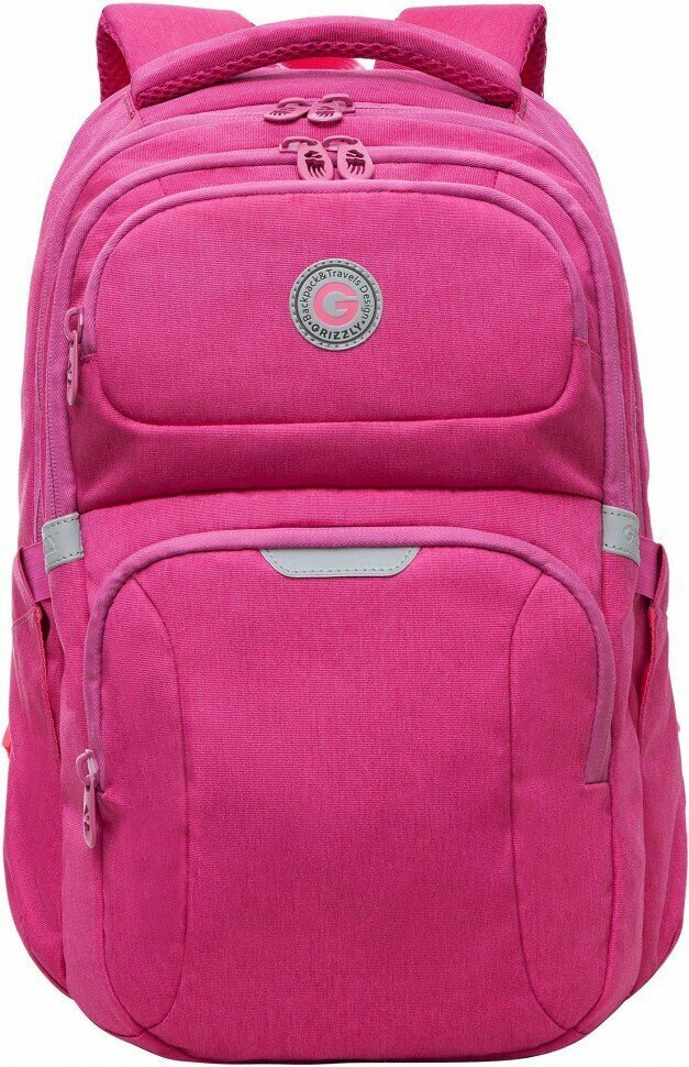Молодежный подростковый рюкзак GRIZZLY для школы 5-11 классы и повседневного использования вы цените вместительность, легкость и практичность. Рюкзак с ортопедической спинкой рассчитан на рост от 150 cм. В женском рюкзаке два основных отделения: большое для крупных вещей, книг, тетрадей и папок А4 и поменьше для принадлежностей. Внутри 5 карманов, включая карман для ноутбука 15”, пенал и брелок для ключей. Снаружи два кармана для мелочей. Боковые кармашки для воды. Все что вам нужно лежит на своих местах. Чтобы разгрузить позвоночник, мы сделали анатомическую спинку с накладками. Она снижает нагрузку и сохраняет вашу осанку. Материал повседневного рюкзака — плотный полиэстер, который хорошо держит форму. За счет водо- грязеотталкивающей пропитки он меньше пачкается и долго остается как новый. Если рюкзак все же чем-то испачкался, мы рекомендуем ручную стирку в холодной воде