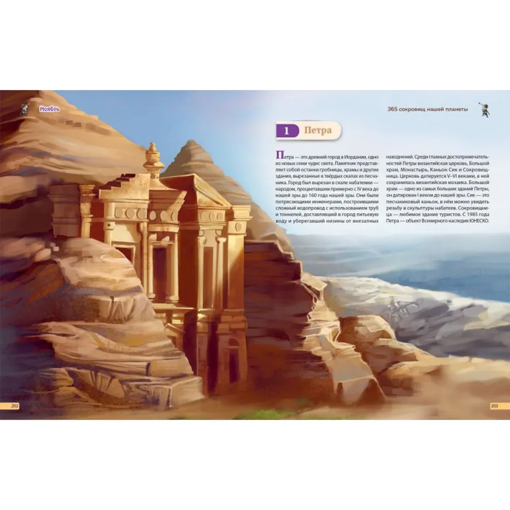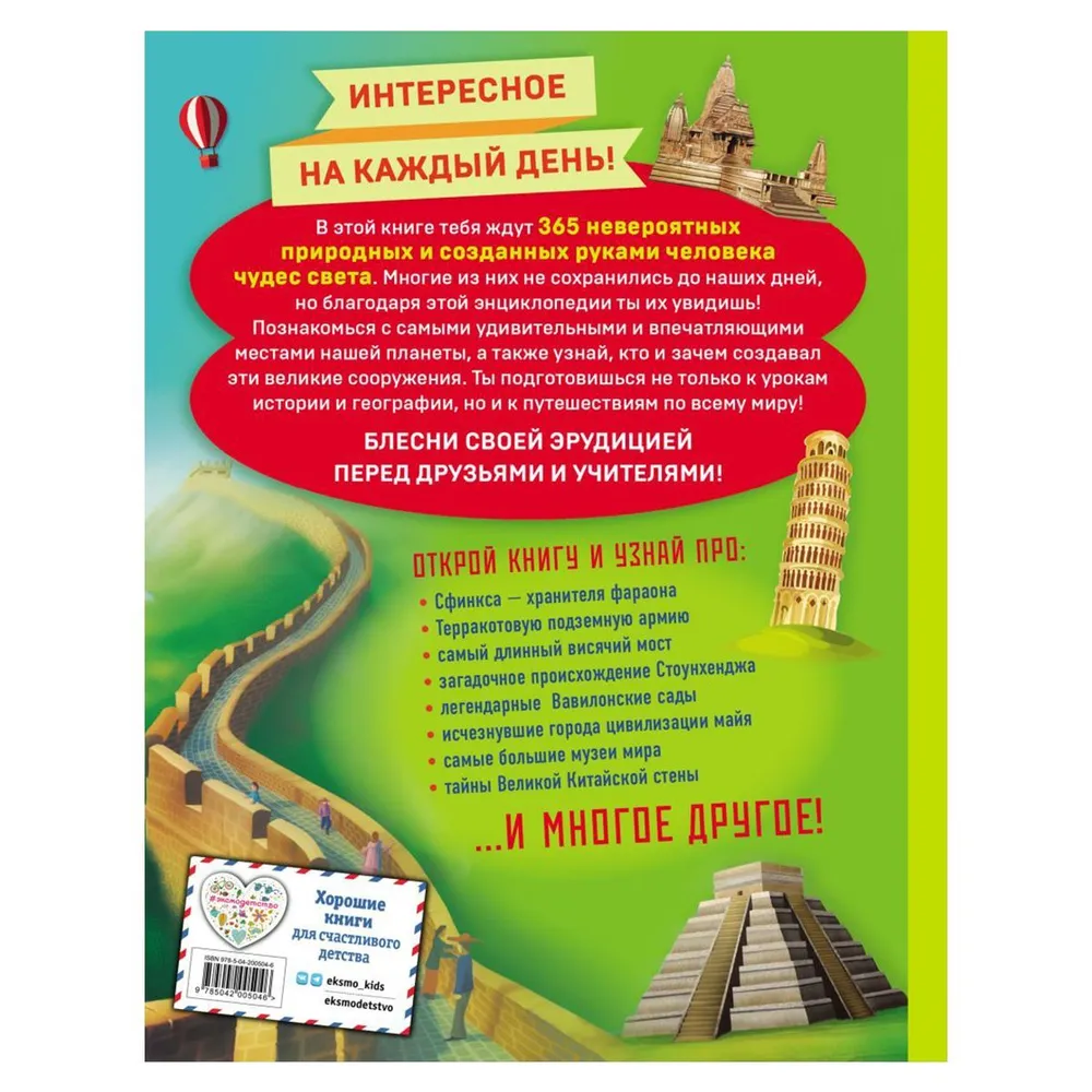 Энциклопедия, с которой будет интересно все 365 дней в году! Ведь в ней представлено ровно 365 самых занимательных фактов о чудесах света — по одному на каждый день каждого месяца. Путешествуя по страницам книги, юный читатель узнает об удивительных архитектурных сооружениях, природных сокровищах, затерянных городах великих цивилизаций древности и многом другом. После её прочтения он обязательно впечатлит друзей и учителей своей эрудицией!