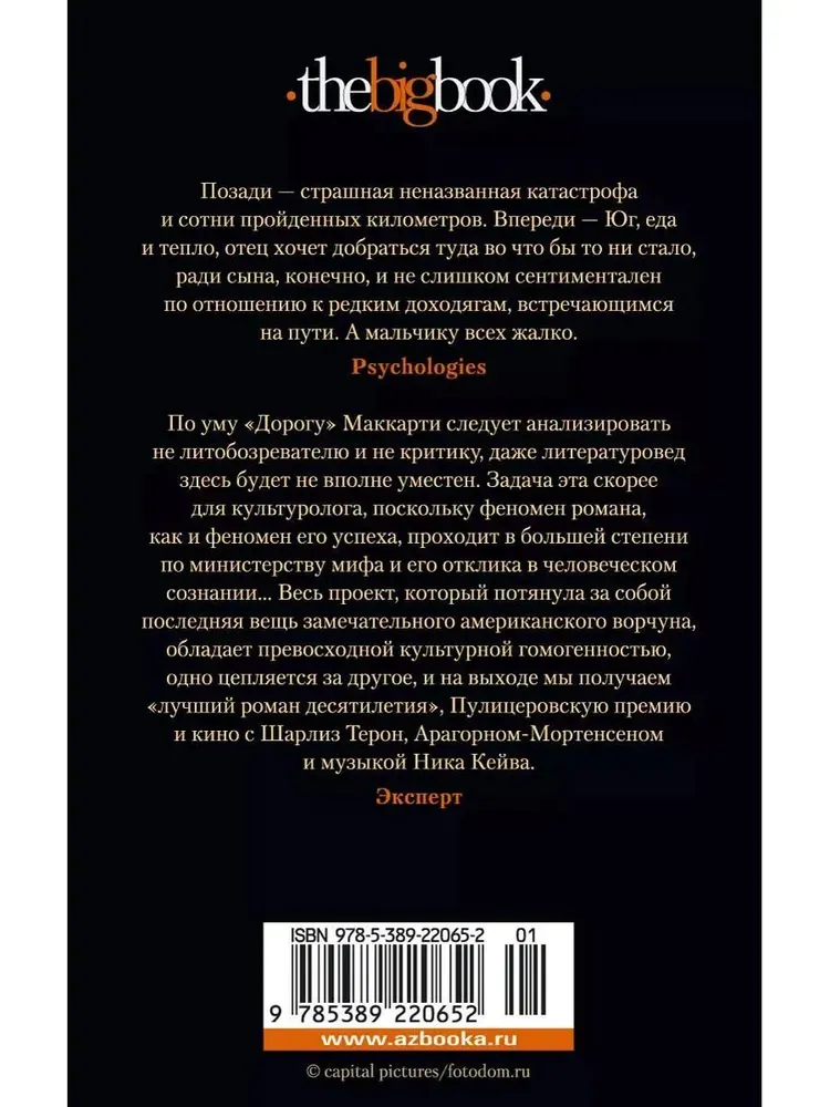Кормак Маккарти — современный американский классик главного калибра, лауреат Макартуровской стипендии «За гениальность», мастер сложных переживаний и нестандартного синтаксиса, хорошо известный нашему читателю романами «Старикам тут не место», «Кровавый меридиан» и «Пограничной трилогией» («Кони, кони...», «За чертой», «Содом и Гоморра»). Но самый громкий успех ждал поздний роман мэтра: «Дорога» получила Пулицеровскую премию и покорила все мыслимые списки бестселлеров. Не замедлил последовать и фильм, поставленный австралийцем Джоном Хиллкоутом («Предложение», «Самый пьяный округ в мире»); главные роли исполнили Шарлиз Терон и Вигго Мортенсен, музыку к фильму написал Ник Кейв. Итак, после катастрофы Отец и Сын идут через выжженные земли, пересекая континент. Всю книгу пронизывают глубокие, ранящие в самое сердце вопросы. Есть ли смысл жить, если будущего — нет? Вообще нет. Есть ли смысл жить ради детей? Это роман о том, что все в жизни относительно, что такие понятия, как добро и зло, в определенных условиях перестают работать и теряют смысл. Это роман о том, что действительно важно в жизни, и о том, как это ценить. И это также роман о смерти, о том, что все когда-нибудь кончается, и поэтому нужно каждый день принимать таким, какой есть. Нужно просто... жить.
