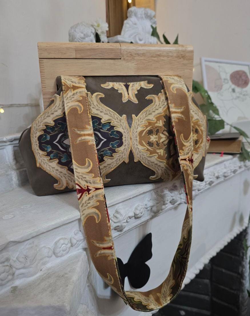 Çanta eko-dəri və üzərində əl işləməli parça materialının kombinasiyasından hazırlanmışdır. Aksesuar hissələri tam təbii taxtadan istehsal olunmuşdur.