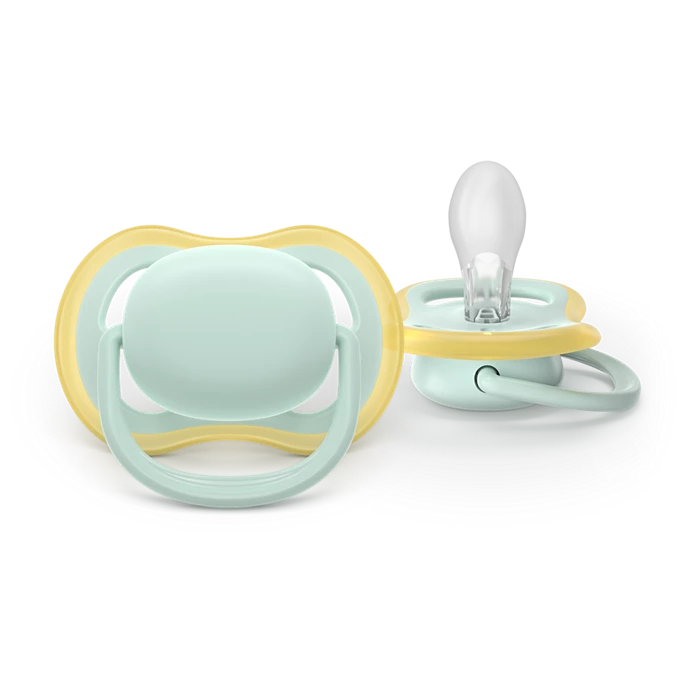 Extra-large airholes let baby's skin breathe Holes in the shield ventilate your baby's skin, keeping it drier for ultimate soothing comfort. Orthodontic teat designed for natural oral development Our orthodontic teats are designed using soft silicone to support natural mouth muscle movements to help lower the risk of malocclusion. The narrow neck teat is designed to reduce pressure between the tongue and palate. Philips Avent ultra Soothers are independently accredited by the Oral Health Foundation. Made from 100% food-grade silicone, they are more durable and long-lasting than rubber (latex) teats and are free from BPA, BPS, phthalate, PVC and polycyclic aromatic hydrocarbons. Loved by babies with a 98% teat acceptance Our textured silicone teats are designed to mimic the feel of mum's breast. When we asked parents how their little ones respond to them, an average of 98% said their babies accept Philips Avent ultra soft soothers.