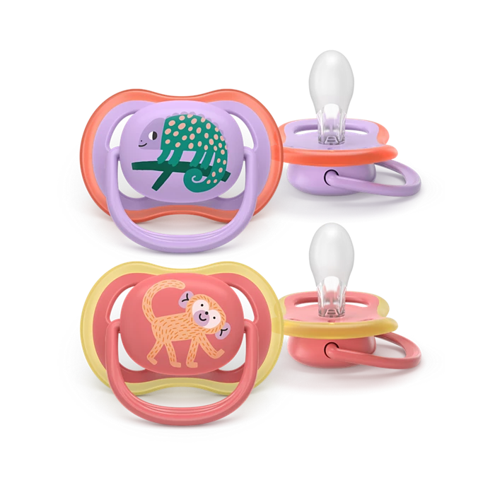 Extra-large airholes let baby's skin breatheHoles in the shield ventilate your baby's skin, keeping it drier for ultimate soothing comfort.Orthodontic teat designed for natural oral developmentOur orthodontic teats are designed using soft silicone to support natural mouth muscle movements to help lower the risk of malocclusion. The narrow neck teat is designed to reduce pressure between the tongue and palate. Philips Avent ultra Soothers are independently accredited by the Oral Health Foundation. Made from 100% food-grade silicone, they are more durable and long-lasting than rubber (latex) teats and are free from BPA, BPS, phthalate, PVC and polycyclic aromatic hydrocarbons.Extra-firm teat for healthy teethingOur soothers are designed to facilitate natural tongue positioning, which is important for healthy speech development as your baby grows. Extra-firm, to comfort baby during teething days. Our textured silicone teat is designed to mimic the feel of mum's breast.