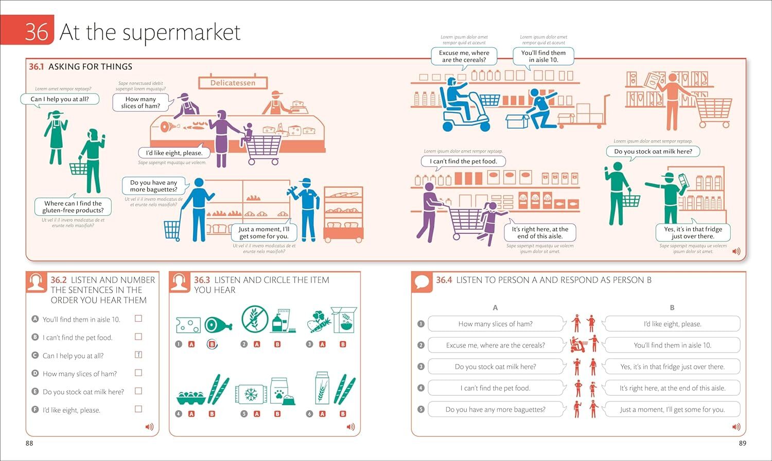 The dialogues are accompanied by audio on the free English for Everyone app, featuring native speakers of English. Listening to the audio helps you tackle any tricky pronunciation and learn how to use tone of voice and emphasis to make your meaning clearer.