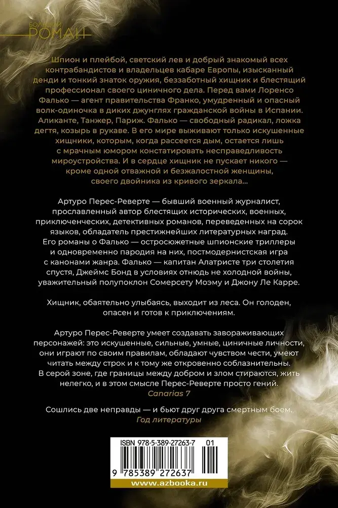 Шпион и плейбой, светский лев и добрый знакомый всех контрабандистов и владельцев кабаре Европы, изысканный денди и тонкий знаток оружия, беззаботный хищник и блестящий профессионал своего циничного дела. Перед вами Лоренсо Фалько — агент правительства Франко, умудренный и опасный волк-одиночка в диких джунглях гражданской войны в Испании. Его направляют в Аликанте, где он должен устроить побег из тюрьмы крупному франкистскому чину; в Танжер, где его начальство надеется заполучить золото Республики; в Париж, где надо скомпрометировать героя войны, а заодно помешать Пабло Пикассо обнародовать монументальное полотно на Всемирной выставке. Фалько — свободный радикал, ложка дегтя, козырь в рукаве. Он ценит храбрость, в том числе и храбрость противника, но в его мире честь — роскошь, и порой непозволительная. В его мире выживают только искушенные хищники, которым, когда рассеется дым, остается лишь с мрачным юмором констатировать несправедливость мироустройства. И в сердце хищник не пускает никого — кроме одной отважной и безжалостной женщины, своего двойника из кривого, идущего рябью зеркала...