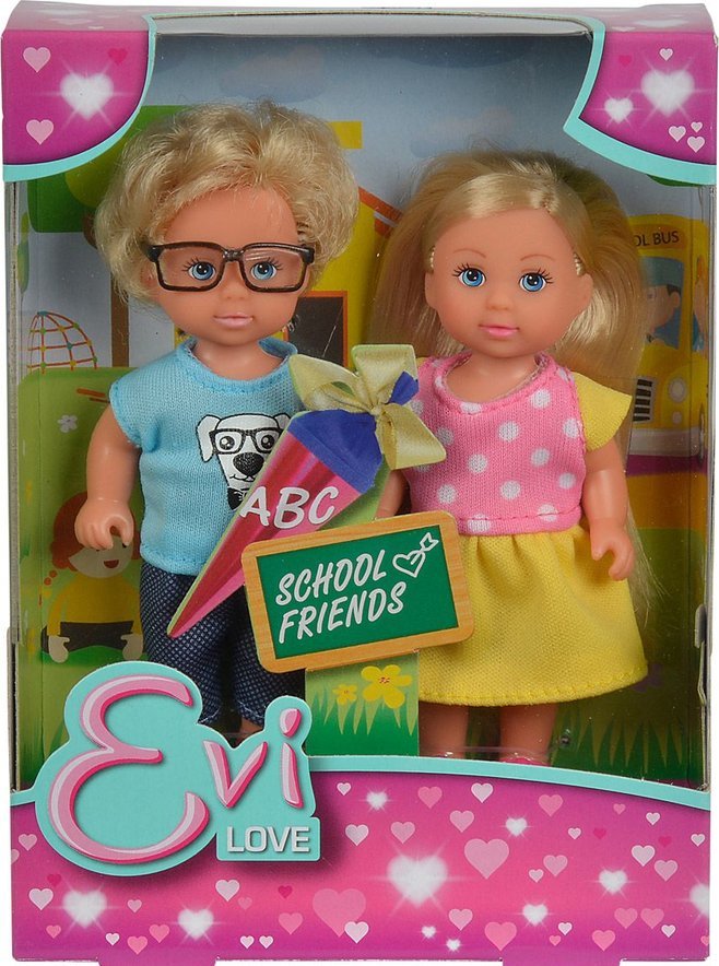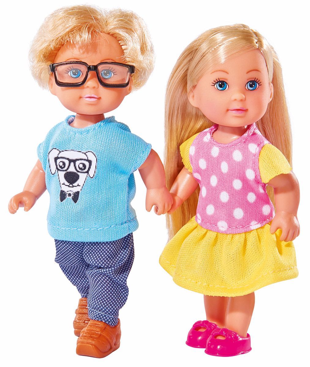 Набор кукол Simba "Еви и Тимми" порадует любую девочку и надолго увлечет ее. Еви и Тимми идут в школу и по пути весело проводят время вместе. Еви одета в красивое платье желтого цвета в горошек и розовые ботиночки, а ее друг - в штанишки синего цвета и голубую футболку с изображением щенка. Вашей дочурке непременно понравится заплетать длинные белокурые волосы куклы, придумывая разнообразные прически. Руки, ноги и голова кукол подвижны, благодаря чему им можно придавать разнообразные позы. Игры с куклами способствуют эмоциональному развитию, помогают формировать воображение и художественный вкус, а также разовьют в вашей малышке чувство ответственности и заботы. Великолепное качество исполнения делают этих кукол чудесным подарком к любому празднику.