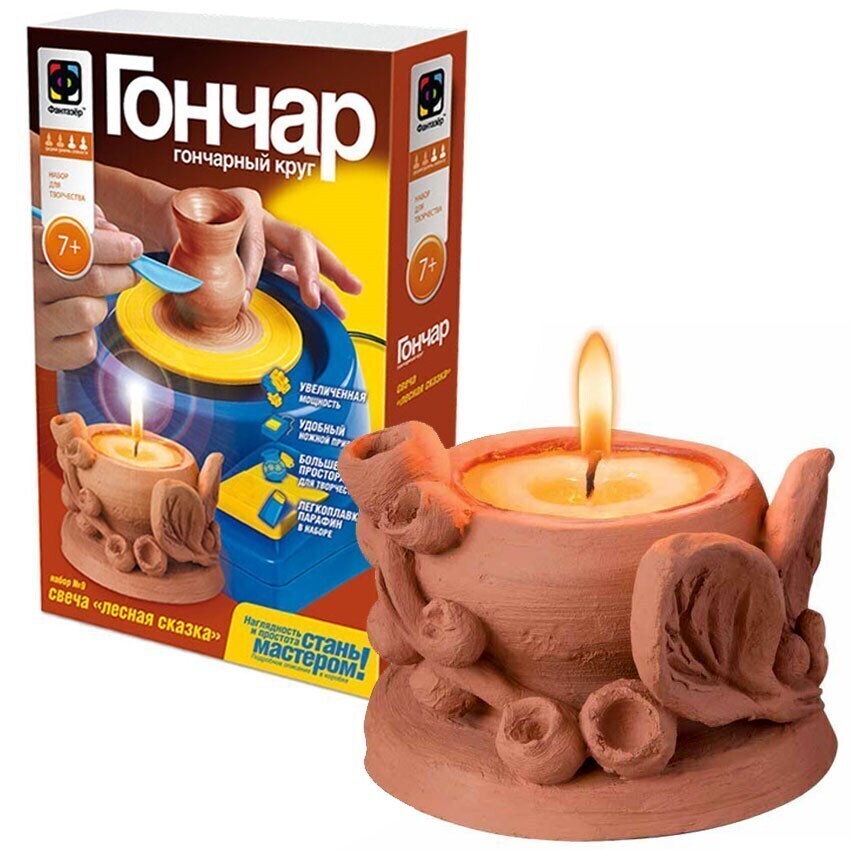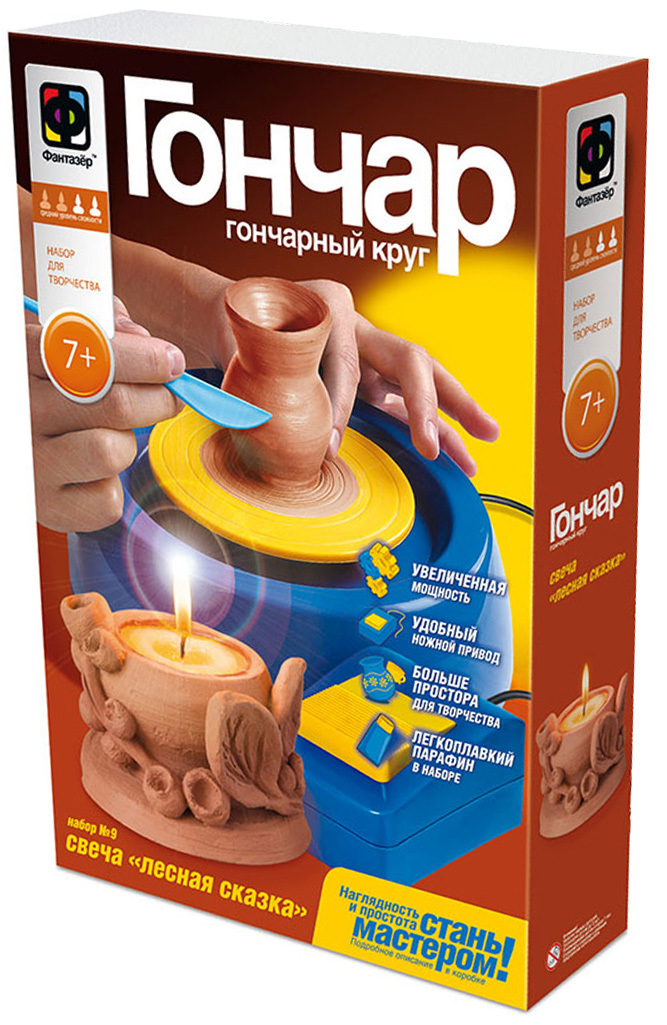 Набор для лепки Фантазер "Лесная сказка" позволит ребенку научиться создавать керамические изделия при помощи гончарного круга. Самая настоящая красная глина и компактный электрический гончарный круг с ножным приводом позволят познакомиться с гончарным делом и создать удивительные поделки из керамики. В комплект также входит легкоплавкий парафин для отливки свечей. Эти образцы гончарного искусства будут служить предметом гордости ребенка, займут его интересным делом, развлекут и пробудят интерес к истории и народным промыслам. Гончарное дело существует очень долгое время. Некоторые гончарные изделия относятся к доисторическому периоду. Из всех этих черепков, сосудов, табличек с надписями, историки узнали много нового из жизни древнего человека. Гончарное дело - одно из древнейших искусств. Много лет назад любую глиняную посуду, сосуд или декоративную вещицу приходилось делать своими руками. В наши дни машины изготавливают большинство из этих повседневных вещей. Изготовление гончарных изделий стало искусством и увлечением. У гончарного круга тоже долгая история. Его использовали в Египте еще за 4000 лет до нашей эры. Гончарный круг не сильно изменился с того времени.