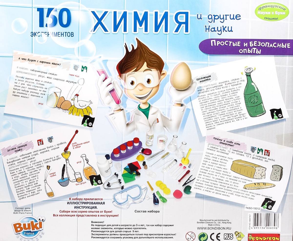 В набор входят растворы и порошки, которые позволяют проводить практически все тесты, доступные в кабинете химии. Можно чистить старые монеты, моделировать скоростную лодку, делать вулкан и газовую пушку и даже сталактиты из соли. Теперь эксперименты можно проводить дома, и учитель для этого совсем не обязателен. Родителям надо обязательно самостоятельно ознакомиться с инструкцией, прежде чем давать ребенку самостоятельно ставить опыты.