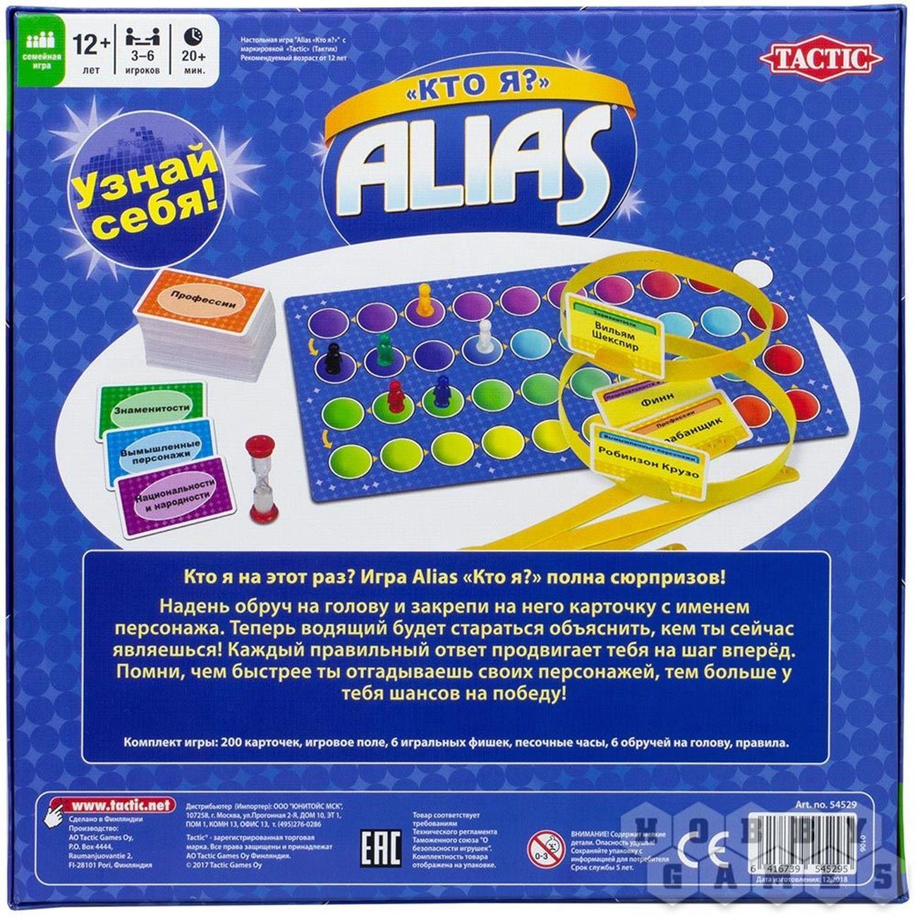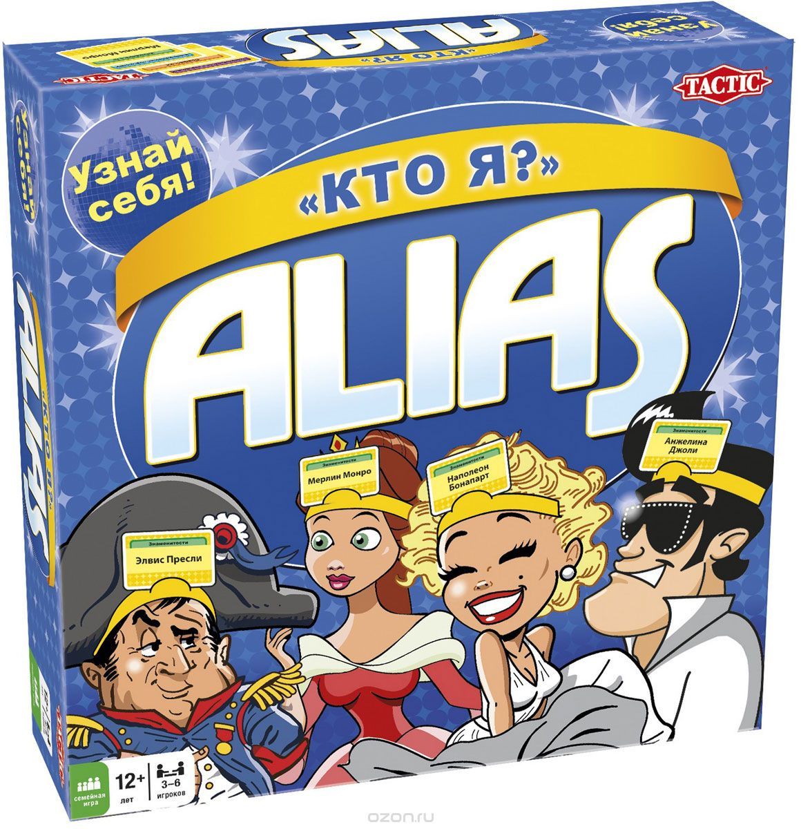 Новая настольная игра из серии Alias от Tactic «Угадай, кто я!». Каждый игрок получает специальный обруч на голову, на котором закрепляет карточки с персонажами. По подсказкам ведущего игроки должны угадать своих персонажей. Правильный ответ позволяет игроку продвигаться вперед по игровому полю. Победителем станет тот, кто первым завершит свой маршрут. Игра рассчитана на 3-6 игроков. В комплектацию входит: - 200 карточек - игровое поле - 6 игральных фишек - 6 обручей на голову - песочные часы - правила на русском языке Семейная игра Скажи иначе «Кто Я?» может быть рекомендована для взрослых и детей от 12 лет.