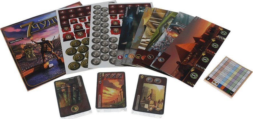 Возглавьте один из семи великих городов античности. Оставьте свой след в истории цивилизации, построив архитектурное чудо: используйте природные ресурсы ваших земель, участвуйте в вечном движении прогресса, развивайте торговые отношения и укрепляйте военную мощь.Партия в игре длится в 3 Эпохи, в каждой из которых используется одна из трех колод карт. Все три Эпохи проходят одинаково: участники разыгрывают по 6 карт, развивая города и возводя Чудеса Света. В конце каждой Эпохи игроки сравнивают военную мощь своих городов с помощью двух соседних городов (принадлежащим игрокам справа и слева.) В конце третьей Эпохи игроки подсчитывают победные очки. Игрок с наибольшим числом очков становится победителем.Средняя продолжительность игры: 30 минут. Рекомендуем!