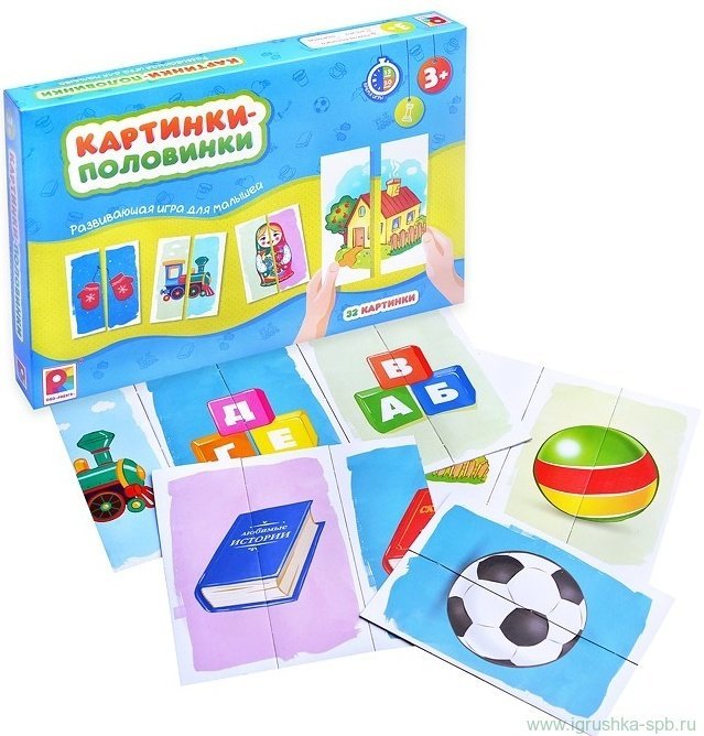 Занимательная игра «Картинки-половинки» предназначена для самых маленьких. Игра способствует развитию необходимых навыков для малыша. - ВНИМАНИЕ: находим сходство и различие между изображениями. - МЕЛКАЯ МОТОРИКА: взаимодействие с карточками. - ЛОГИЧЕСКОЕ МЫШЛЕНИЕ: собираем единую картинку. В набор входит 32 картинки в ярких цветах. Карточки выполнены из плотного картона, размер одной цельной карточки (ДхШ) составляет 10х14 см. Рекомендованный возраст: 3 года +