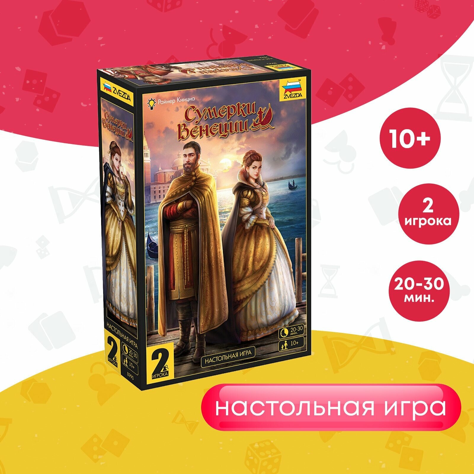 В состав настольной игры Сумерки Венеции входят: карточки – 54 шт.; памятки – 2 шт.; деревянные Фишки – 6 шт.; игровое поле; правила.