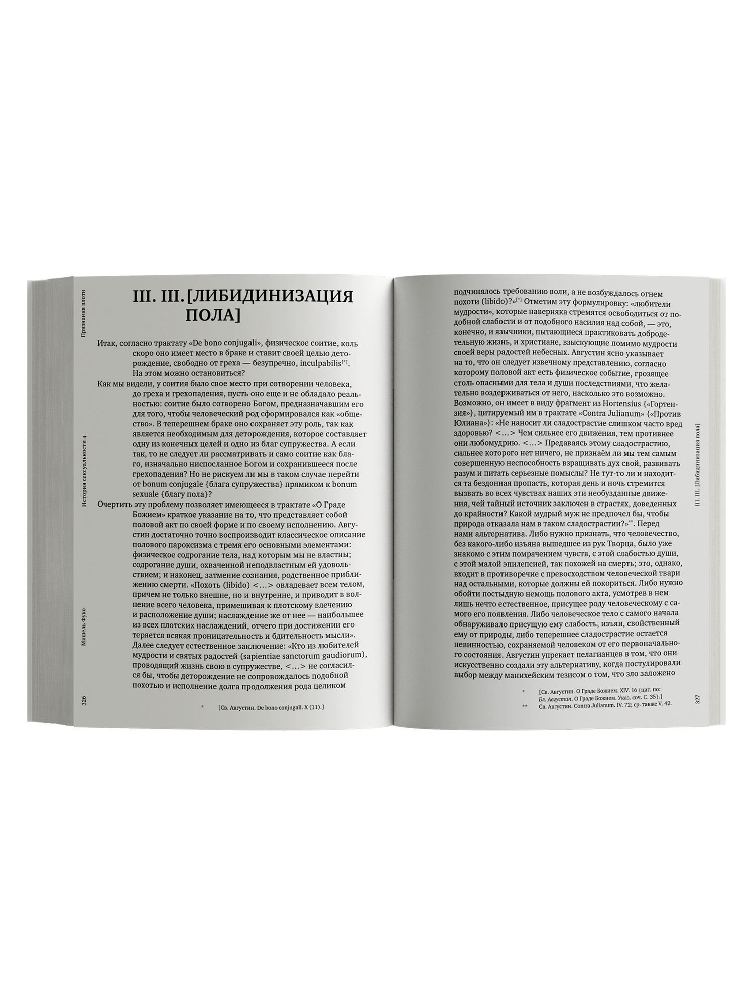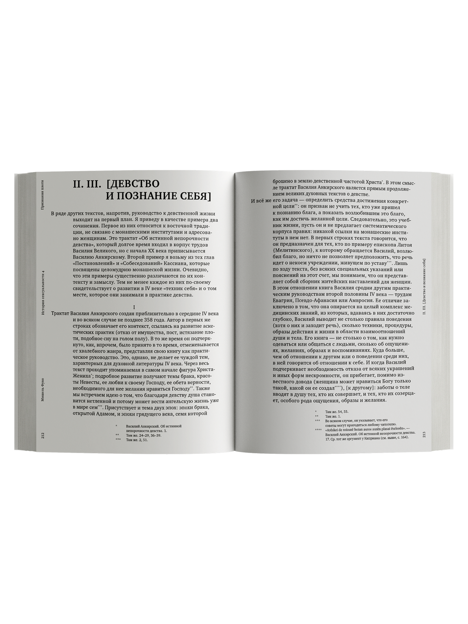 «Признания плоти» — последняя работа выдающегося французского философа и историка Мишеля Фуко (1926–1984), завершенная им вчерне незадолго до смерти и опубликованная на языке оригинала только в 2018 году. Она продолжает задуманный и начатый Фуко в середине 1970-х годов проект под общим названием «История сексуальности», круг тем которого выходит далеко за рамки половых отношений между людьми и их осмысления в античной и христианской культуре Запада. В «Признаниях плоти» речь идет о разработке вопросов плоти в трудах восточных и западных Отцов Церкви II–IV веков, о формировании в тот же период монашеских и аскетических практик, связанных с телом, плотью и полом, о христианской регламентации супружеских отношений и, шире, об эволюции христианской концепции брака. За всеми этими темами вырисовывается главная философская ставка «Истории сексуальности» и вообще поздней мысли Фуко — исследование формирования субъективности как представления человека о себе и его отношения к себе.