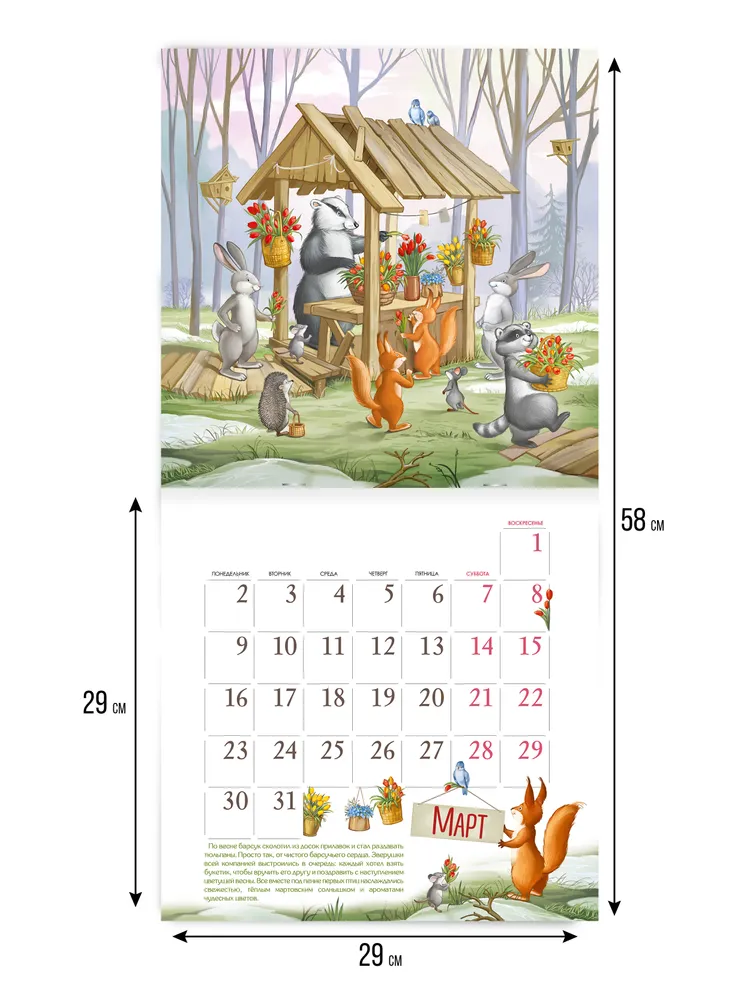Добрый календарь настенный перекидной создан для того, чтобы каждый месяц 2026 года превратился для вас и ваших близких в сказочное путешествие. Его формат А2 (580×290 мм) и крупная, хорошо читаемая календарная сетка позволяют легко ориентироваться в датах даже с дальнего расстояния. Просторные клетки дают возможность оставлять заметки, планировать встречи или помечать важные события. Календарь 2026 год изготовлен с использованием качественных материалов: обложка выполнена из плотного картона 220 г/м², страницы — из мелованной бумаги 170 г/м², что обеспечивает четкость и яркость печати. Благодаря прочной скрепке листы надежно держатся, а отверстие в верхней части обложки позволяет легко повесить календарь на стену. Календарь настенный ретро оформлен в запоминающейся милой авторской манере. Каждая страница — это отдельная история с лесными героями. Эти иллюстрации не только радуют глаз, но и создают атмосферу доброты и уюта, наполняя дом или класс ощущением настоящего волшебства. Текст-сказку можно читать детям перед сном или использовать для создания уютной семейной традиции. Календарь детский станет отличным подарком ребенку, ведь он не только поможет выучить месяцы и дни недели, но и познакомит с милыми историями о дружбе, помощи и приключениях лесных зверят. Он подойдет для детской комнаты, школьного класса, библиотеки. Яркие рисунки и трогательные сюжеты создадут настроение праздника и ожидания нового месяца, а просторная сетка позволит взрослым и детям вместе планировать время. Календарь с зверятами — это не просто способ отслеживать даты, а настоящий источник вдохновения и тепла, который каждый день будет напоминать о простых радостях и важности заботы о близких. Такой аксессуар сделает планирование приятным и подарит много поводов для улыбок на протяжении всего года.