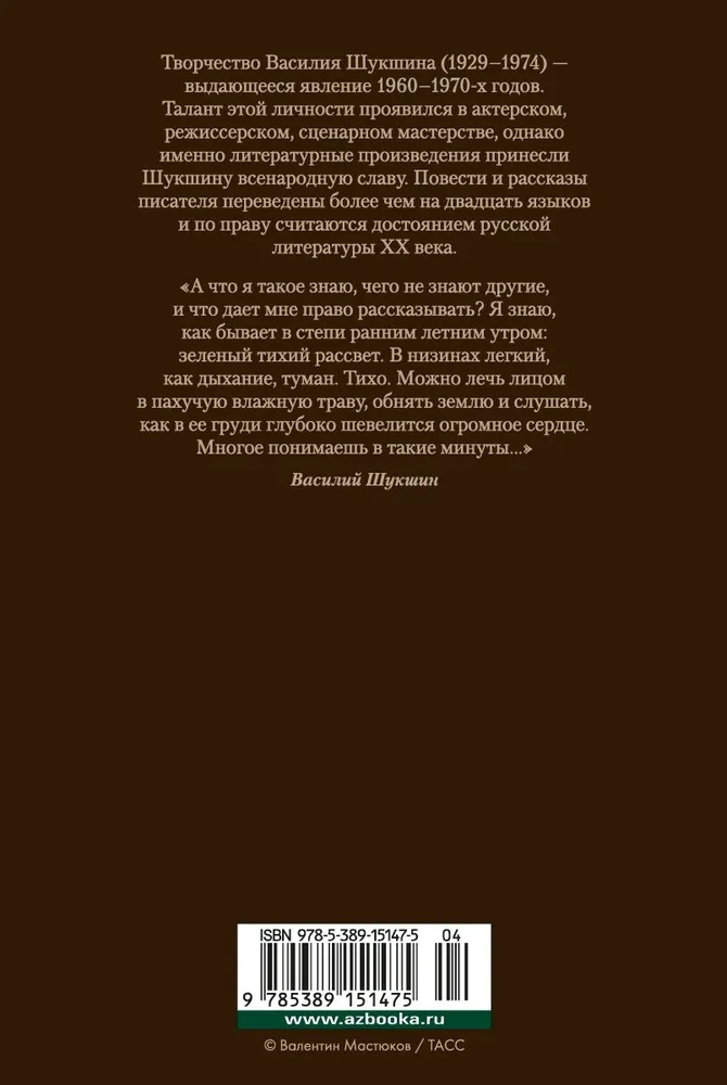 Творчество Василия Шукшина (1929–1974) — выдающееся явление 1960–1970-х годов. Талант этой личности проявился в актерском, режиссерском, сценарном мастерстве, однако именно литературные произведения принесли Шукшину всенародную славу. Повести и рассказы писателя переведены более чем на двадцать языков и по праву считаются достоянием русской литературы ХХ века.