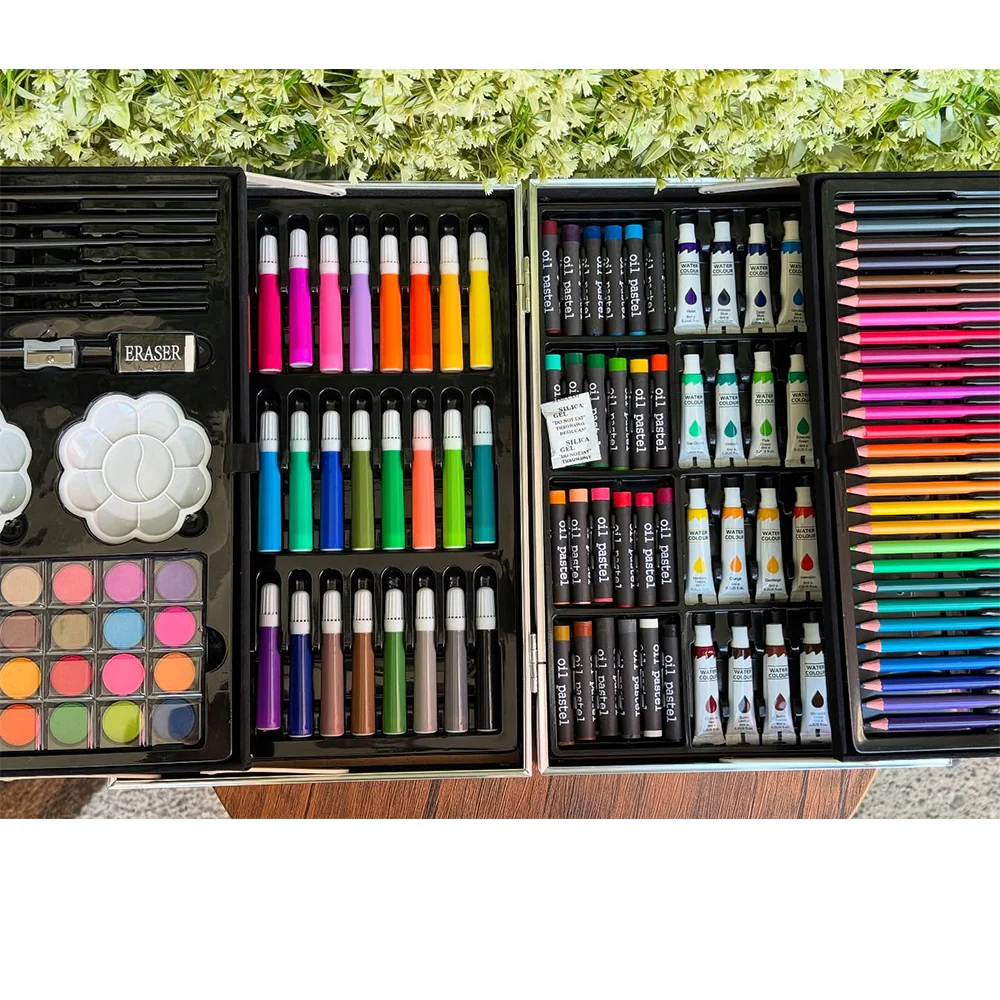 Set includes : 28 Color pencils , 24 Watercolor, 33 Markers, 24 Oil pastel, 24 Watercolor cakes, 3 plastic palettes, 4 bristle brushes: round and flat , 2 Pencils, 2 eraser, 1 pencil sharpener.