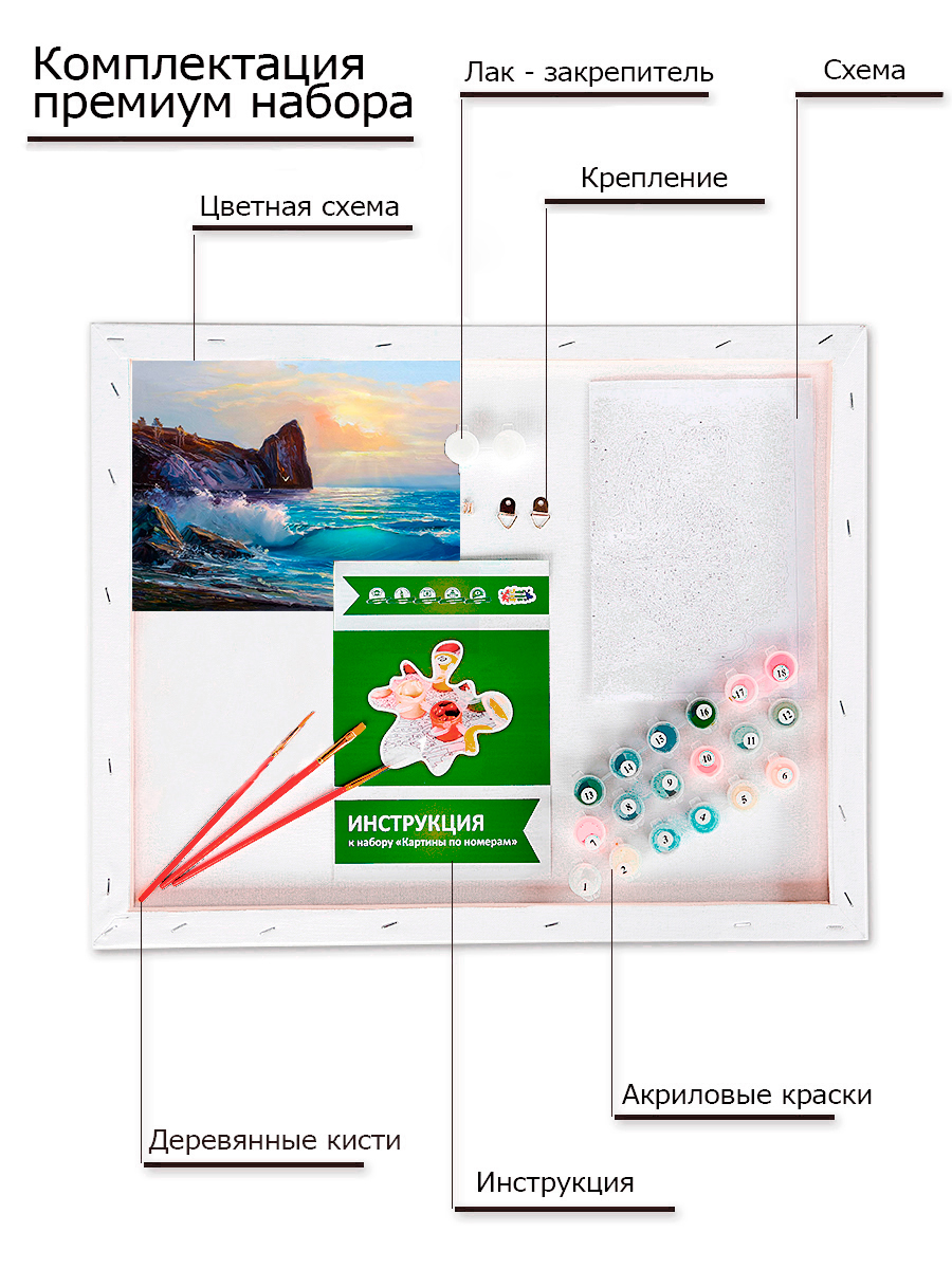 Картина по номерам от ТМ Цветной комплектации Премиум. В набор входит: - Хлопковый холст на подрамнике. - Акриловые краски в вакуумной упаковке. - Крепление на стену. - Удобная коробка с ручкой и прозрачной областью. - Три синтетические кисти с деревянной ручкой. - Цветная печать областей с цифрами на холсте. - Две баночки с закрепителем цвета. - Цветная книжка-инструкция. - Цветной чек-лист. Преимущества: 1. Натуральный хлопковый холст, натянутый на деревянный подрамник из высушенной…