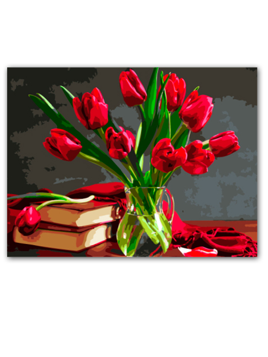 Картина по номерам "Букет красных тюльпанов", 40х50 см Цветной, цвет красный, размер 410x510x25 мм Набор для раскрашивания по номерам. В набор входит подарочная коробка, хлопковый холст на деревянном подрамнике с черно-белым контурным рисунком, краски акриловые в вакуумной упаковке, 3 пластмассовые кисти, чек-лист, крепление на стену.