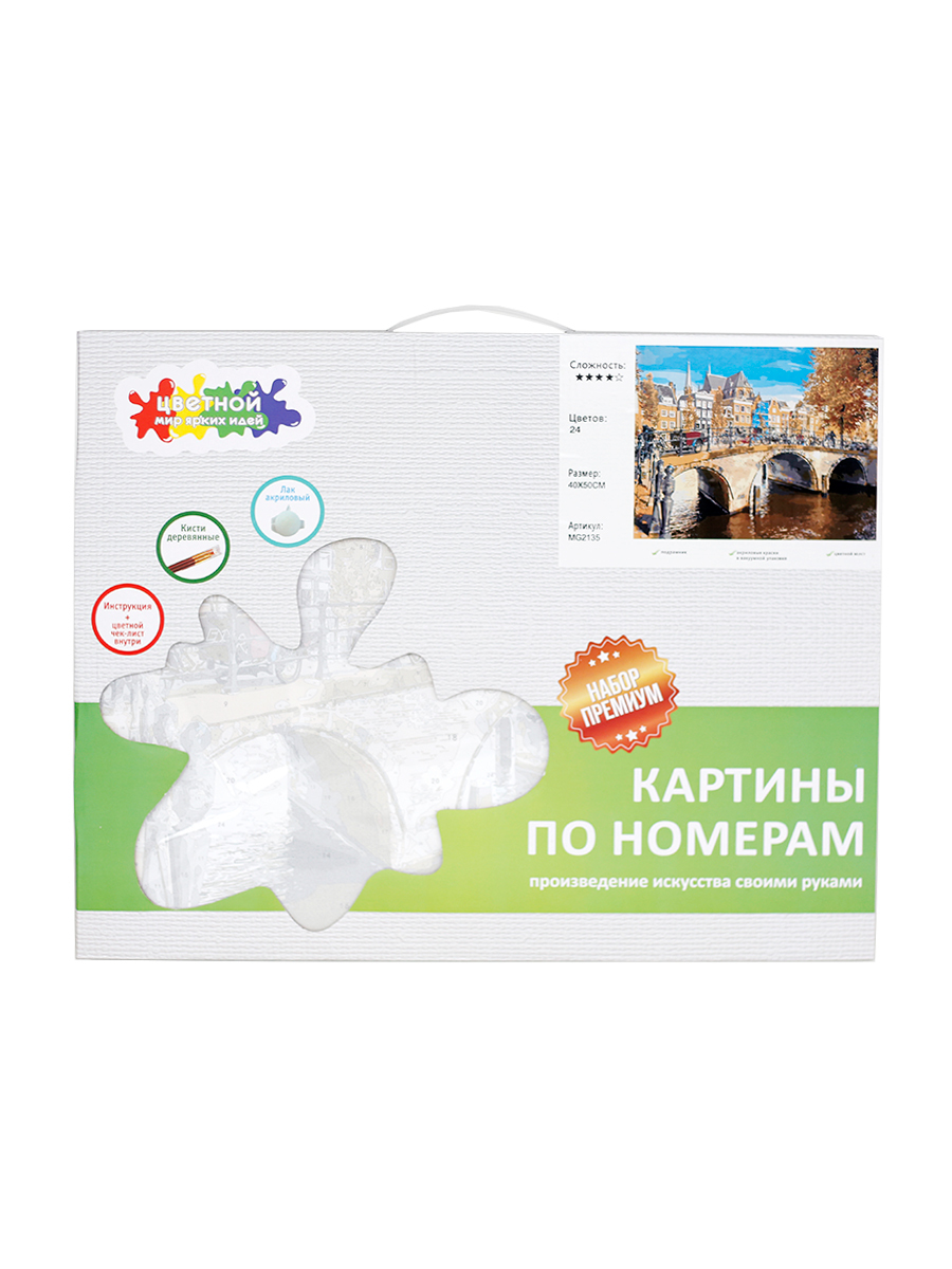 Картина по номерам от ТМ Цветной комплектации Премиум. В набор входит: - Хлопковый холст на подрамнике. - Акриловые краски в вакуумной упаковке. - Крепление на стену. - Удобная коробка с ручкой и прозрачной областью. - Три синтетические кисти с деревянной ручкой. - Цветная печать областей с цифрами на холсте. - Две баночки с закрепителем цвета. - Цветная книжка-инструкция. - Цветной чек-лист. Преимущества: 1. Натуральный хлопковый холст, натянутый на деревянный подрамник из высушенной…