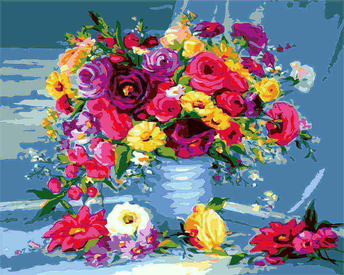 Картина по номерам "Натюрморт с букетом", 40х50 см Цветной, цвет мультиколор, размер 410x510x25 мм Набор для раскрашивания по номерам. В набор входит подарочная коробка с пластиковым окном, хлопковый холст на деревянном подрамнике с цветным контурным рисунком, краски акриловые в вакуумной упаковке, 2 кисти, чек-лист черно-белый, чек-лист цветной, цветная книжка инструкция, лак - закрепитель в комплекте, крепление на стену.