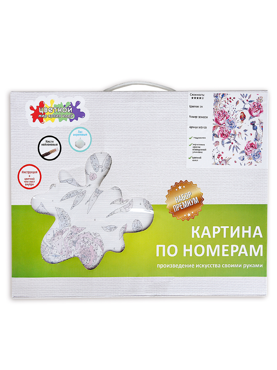 Картина по номерам от ТМ Цветной комплектации Премиум. В набор входит: - Хлопковый холст на подрамнике. - Акриловые краски в вакуумной упаковке. - Крепление на стену. - Удобная коробка с ручкой и прозрачной областью. - Три синтетические кисти с деревянной ручкой. - Цветная печать областей с цифрами на холсте. - Две баночки с закрепителем цвета. - Цветная книжка-инструкция. - Цветной чек-лист. Преимущества: 1. Натуральный хлопковый холст, натянутый на деревянный подрамник из высушенной…