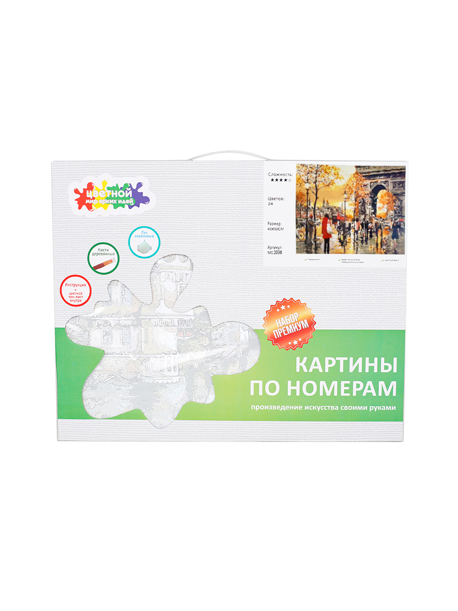 Картина по номерам от ТМ Цветной комплектации Премиум. В набор входит: - Хлопковый холст на подрамнике. - Акриловые краски в вакуумной упаковке. - Крепление на стену. - Удобная коробка с ручкой и прозрачной областью. - Три синтетические кисти с деревянной ручкой. - Цветная печать областей с цифрами на холсте. - Две баночки с закрепителем цвета. - Цветная книжка-инструкция. - Цветной чек-лист. Преимущества: 1. Натуральный хлопковый холст, натянутый на деревянный подрамник из высушенной сосны. 2. Галерейная натяжка холста без волн и провисаний. 3. Акриловые краски упакованы в вакуум, что позволяет хранить и транспортировать без ограничения температуры. Краски не теряют своих свойств не высыхают и не портятся. 4. Авторские сюжеты, проработанные художником и дизайнером.