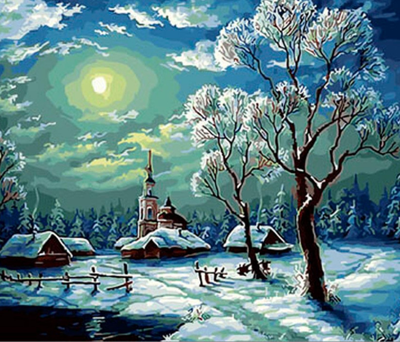 Картина по номерам "Зимний ночной пейзаж", 40х50 см Цветной, цвет голубой, размер 410x510x25 мм Набор для раскрашивания по номерам. В набор входит подарочная коробка, хлопковый холст на деревянном подрамнике с черно-белым контурным рисунком, краски акриловые в вакуумной упаковке, 3 пластмассовые кисти, чек-лист, крепление на стену.