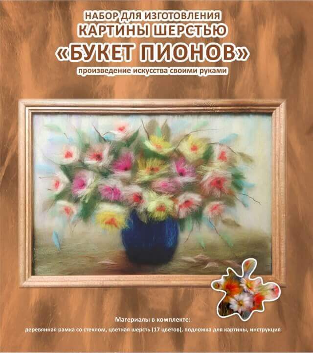 В набор входит: подарочная коробка, книжка-инструкция, цветная шерсть, подложка, деревянная рамка со стеклом, трафарет по необходимости.