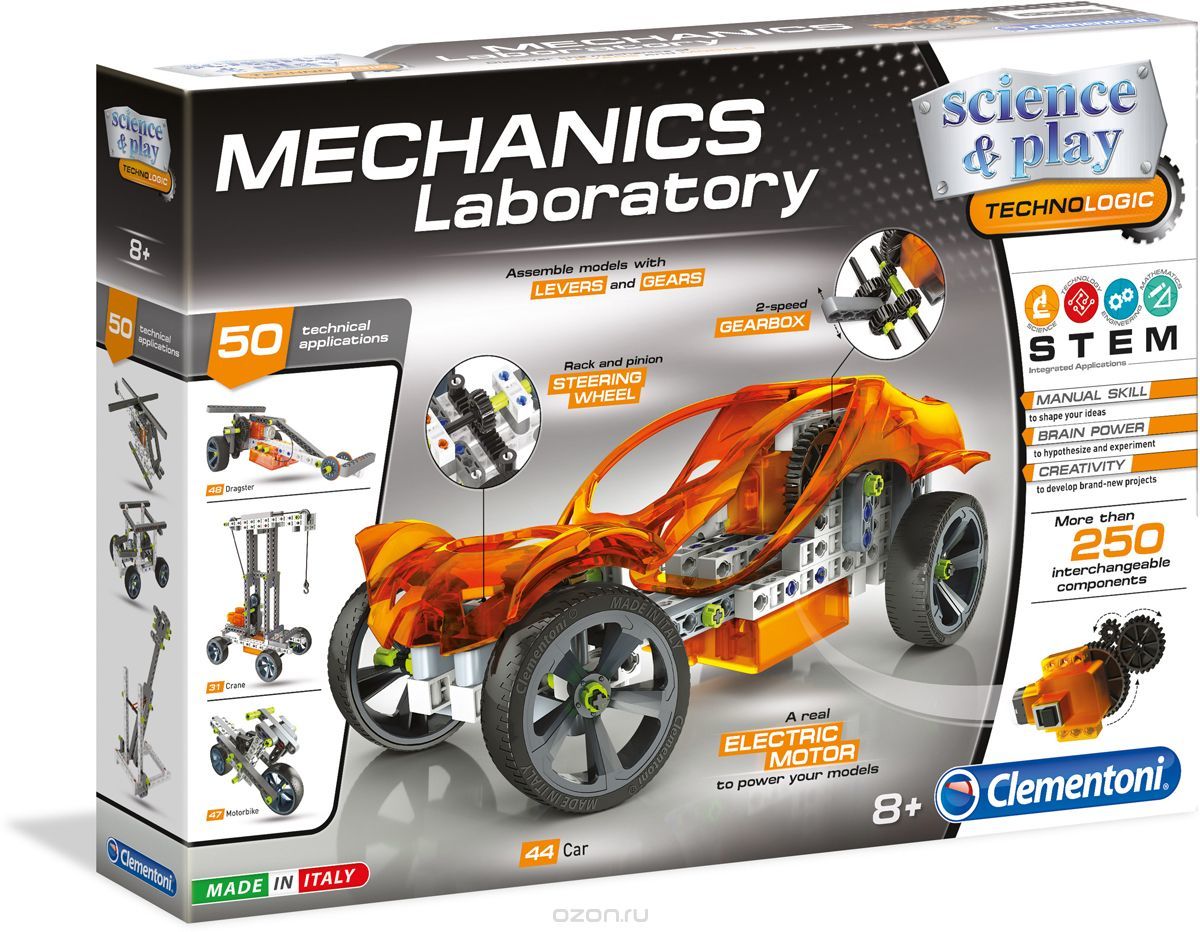 Набор "Большая механическая лаборатория" с помощью которого можно более подробно изучить принципы механики и техники! Благодаря более чем 250 деталям, вы можете создать до 50 сложных моделей! Ребенок почувствует себя настоящим инженером! Построить вертолет, мощный кран и даже автомобиль с электрическим двигателем, в котором вы сможете взаимодействовать вручную с коробкой передач и рулевым управлением! Иллюстрированные научные руководства помогут ребенку в различных этапах монтажа.