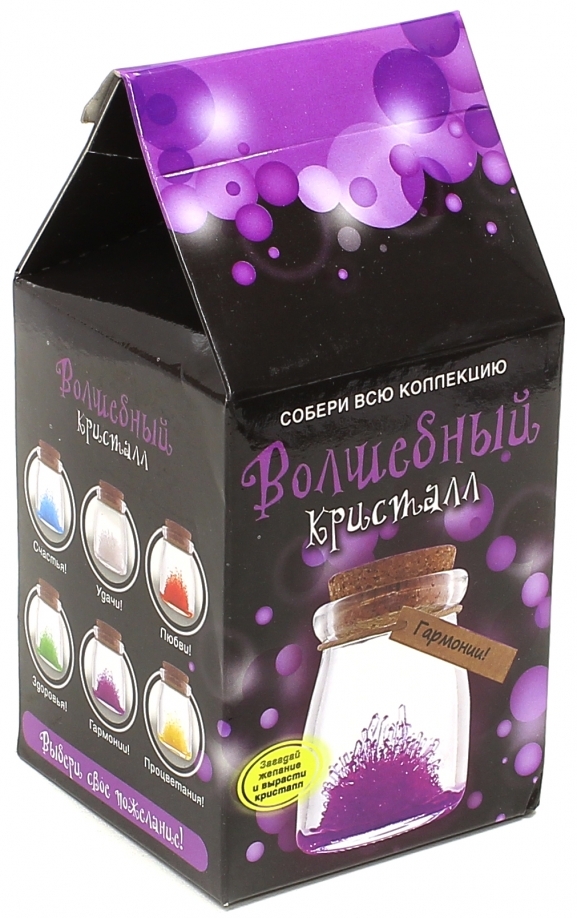 В каждом наборе из серии: красивая баночка, в которой удобно следить за выращиванием кристаллов, волшебный кристаллический порошок, кристаллическая таблетка, палочка для перемешивания, пробка, веревочка, карточка с пожеланием и инструкция.