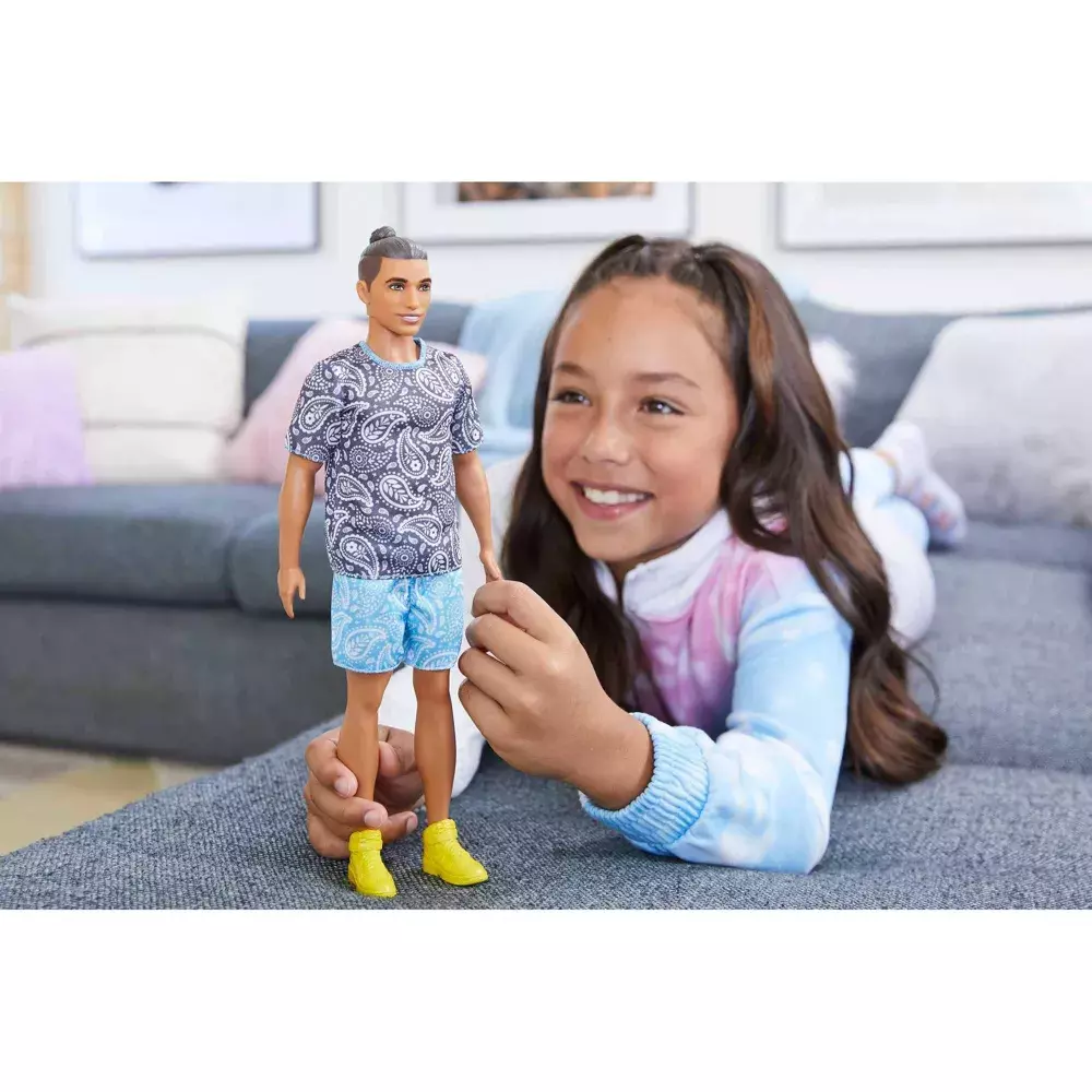 Кукла Кен имеет широкое телосложение и каштановые волосы, собранные в пучок. Его серая футболка и бирюзовые шорты украшены сплошным принтом пейсли, что создает забавный несочетаемый образ!