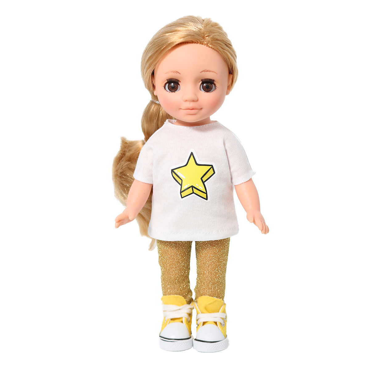 Кукла Ася Яркая звездочка – образ блистательной и мечтательной девочки с обаятельным личиком и большими красивыми глазами. В комплект одежды входит: длинная футболка с термоаппликацией «Звезда», золотистые лосины, трусики, кеды. Ася станет настоящей подружкой для вашего ребенка!