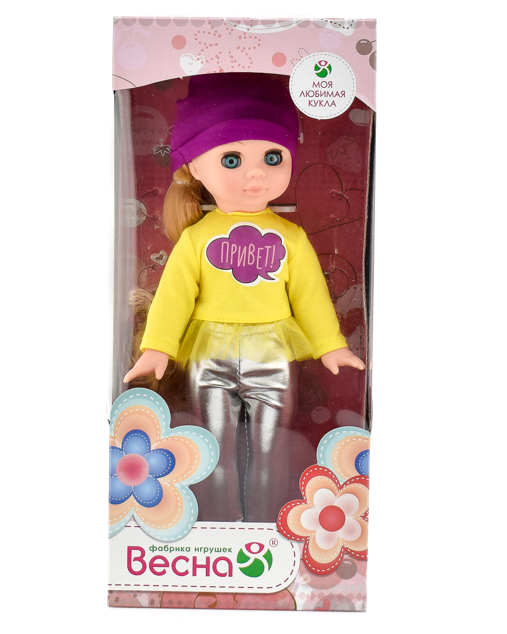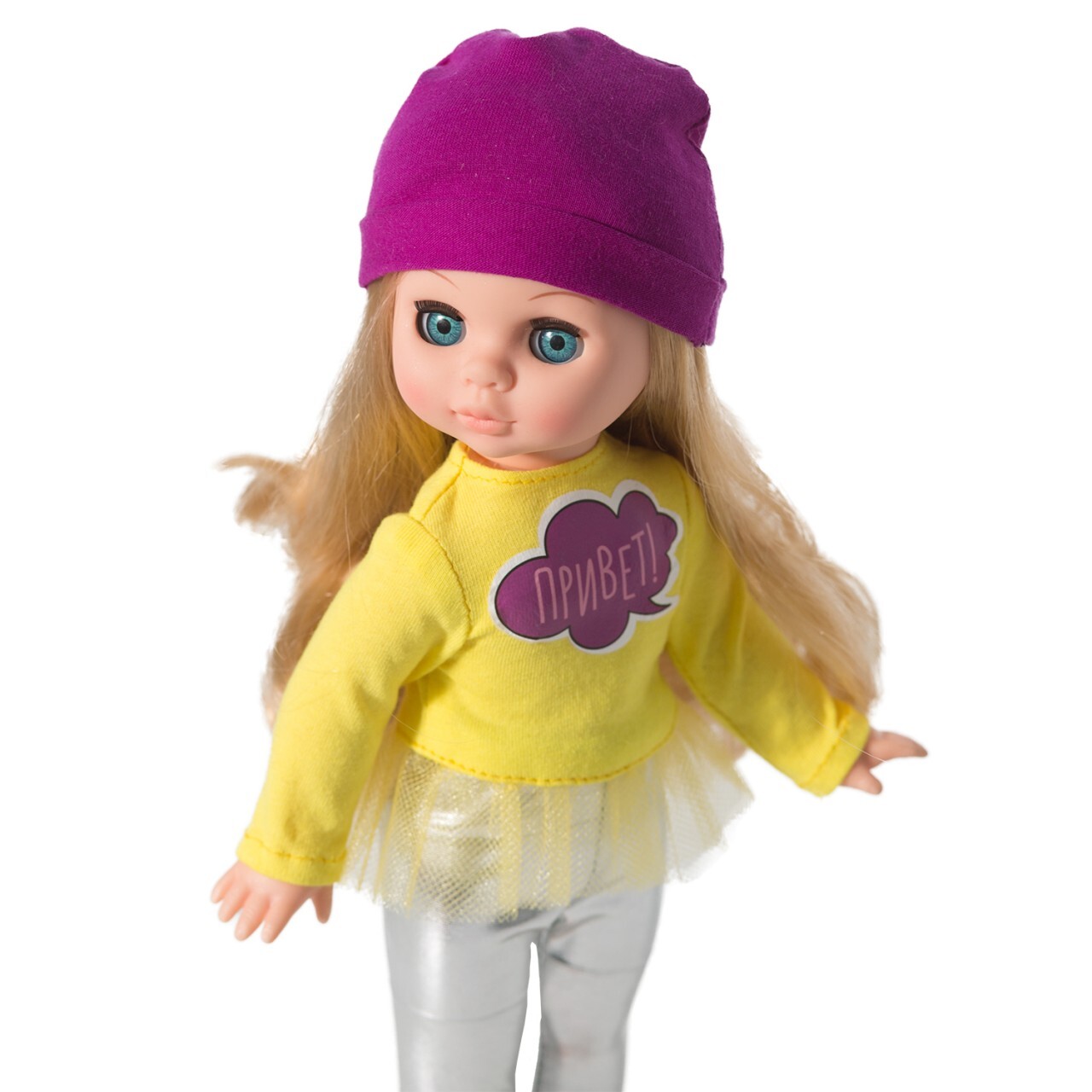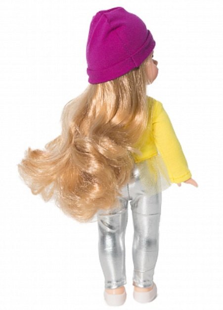 Рост куклы 30,5 см. Кукла не озвучена. Глаза вставные закрывающиеся. Тело куклы стройное и пропорциональное. Ручки и голова выполнены из эластичного, приятного на ощупь винила, а туловище и ноги из пластмассы. В комплект одежды входит: трикотажная футболка с длинным рукавом и наклейкой «Привет», по низу футболки отделка из сетки, серебристые лосины из парчового трикотажа. Вся одежда застёгивается сзади на липкую ленту. На голове трикотажная шапочка, на ногах туфельки. Цвет одежды, волос и глаз куклы может отличаться от фотографии.