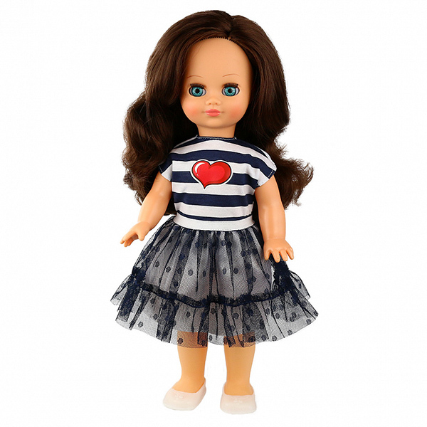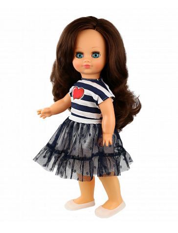 В комплект одежды коллекции «Яркий стиль 2» входит: трикотажная футболка в полоску с наклейкой «сердце» и юбка из сетки с оборкой. На ногах туфельки. Кукла озвучена. Глаза вставные закрывающиеся. Тело куклы стройное и пропорциональное.