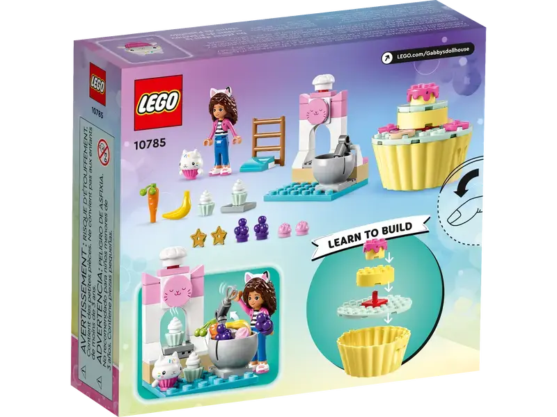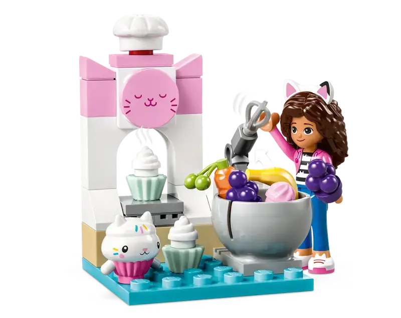 Дети могут присоединиться к Габби и Кейки на кухне. В наборе есть миксер, ингредиенты, такие как взбитые сливки, фрукты и шоколад, а также кошачья печь. Большой многоярусный торт имеет вращающуюся верхнюю часть, которую дети могут украсить вкусными декорациями, включая глазурь, фрукты, шоколад и две золотые звездочки. Используя стартовый кубик в качестве формы для выпечки, дети быстро познают радость творческого конструирования. После этого все аксессуары можно хранить внутри большого торта. В коробке есть инструкции в виде красочного комикса, а приложение LEGO Builder включает в себя интуитивно понятные функции масштабирования и вращения.