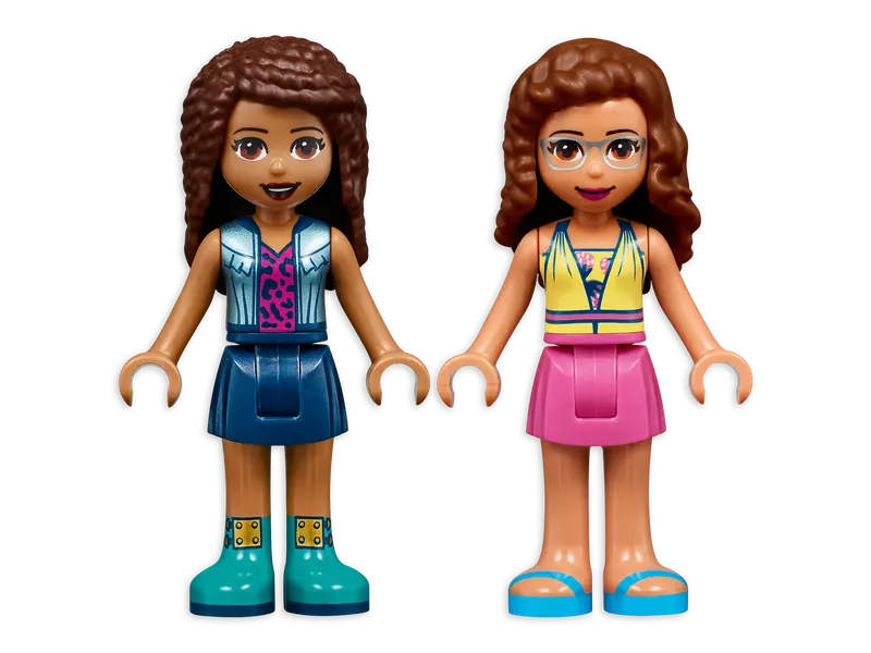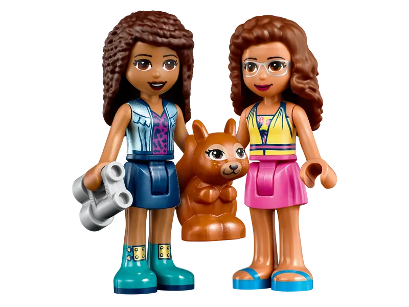 Comes with LEGO Friends Andrea and Olivia mini-dolls, a squirrel figure, a scooter, campfire, marshmallow on a stick, a bridge that crosses a river and a woodland waterfall.
