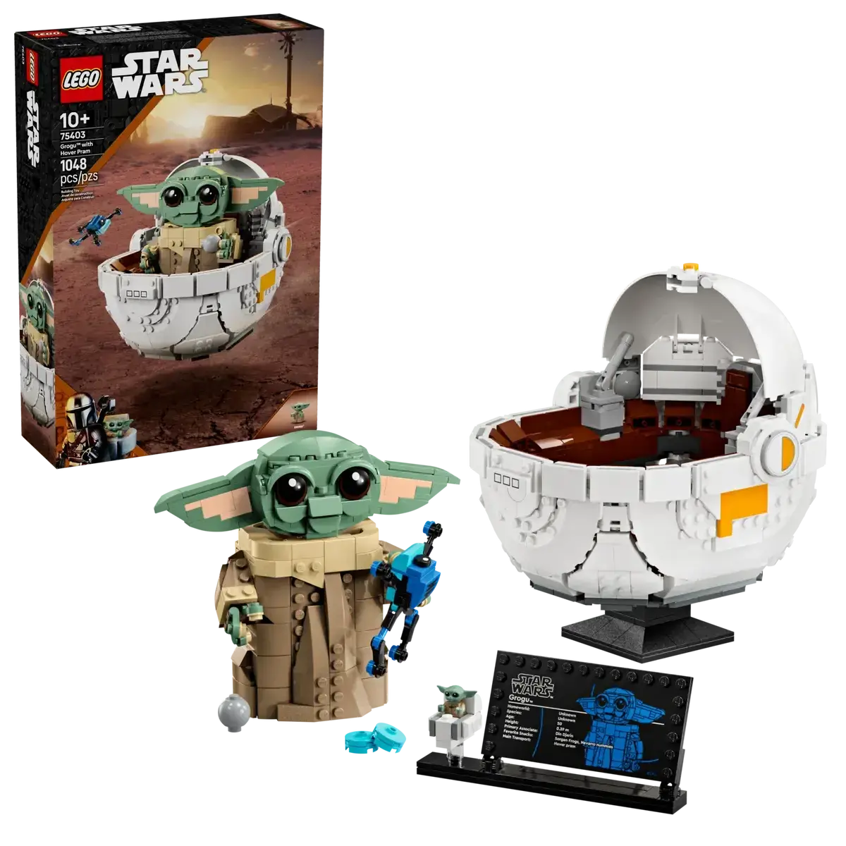 Grogu LEGO® figure – The main buildable toy model comes with a Grogu information plaque on a stand with space for the included standard-size Grogu LEGO figure in a small buildable hover pram