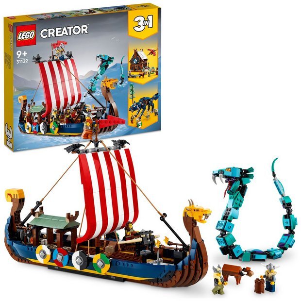 Детей от 9 лет ждут захватывающие приключения с этим набором «Корабль викингов 3 в 1» LEGO Creator и змея Мидгаарда (31132). Эта модель традиционного корабля викингов имеет 8 щитов, катапульту, стреляющую шипами, корову и 2 воронов, сделанных из кубиков LEGO, а также морского змея Мидгаарда в подвижной позе для забавных историй.