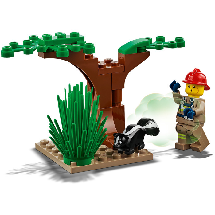 Набор конструктора LEGO City Пожарные: Пожарный самолёт состоит из 363 деталей. С ним ребенок от 6 лет сможет собственными руками собрать пожарный самолет, пожарный внедорожник, 2 дерева и дополнительные аксессуары. Самолет выполнен в красном цвете, украшен соответствующей символикой. Оно снащен вращающимися лопастями и открывающимся люком, а в кабину пилота можно усадить минифигурку. Внедорожник с вращающимися колесами выполнен в красном цвете и украшен соответствующей символикой. На сиденье водителя можно усадить минифигурку, а не корпусе установлен водомет, стреляющий голубыми деталями. Также в состав набора входят три минифигурки, фигурка скунса, дополнительные аксессуары и детали в форме языков пламени. С ними можно даже разыграть увлекательные сценки тушения пожара в лесу с земли и с воздуха.