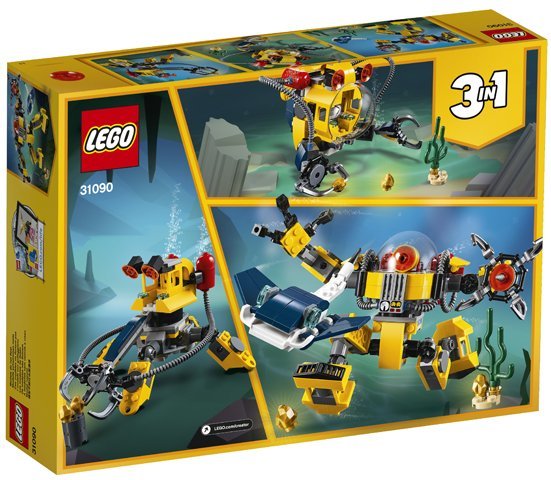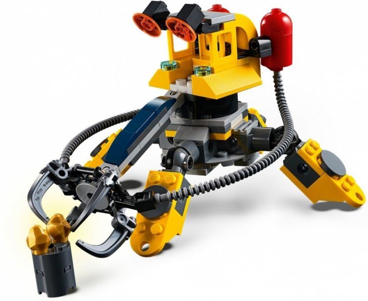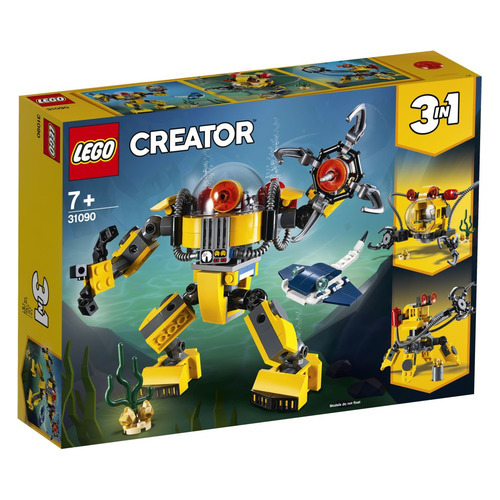 Ищи сокровища на дне океана с помощью этого «Робота для подводных исследований» LEGO Creator 3 в 1 (31090) с гибкими конечностями, куполообразным шлемом, красным роботизированным глазом, балластными цистернами и большими ступнями для перемещения по морскому дну. Открепи роботизированный глаз, чтобы превратить куполообразный шлем в кабину с центром управления. Левая рука Робота выполнена в форме клешни со сверлом, а правая - в форме захвата. В набор также включены сборный скат-манта, небольшой участок морского дна с водорослями и золотыми самородками. Из каждого набора LEGO Creator 3 в 1 можно собрать три различных модели. Собери этого Робота для подводных исследований, а затем перестрой его в Субмарину или Подводный кран для поиска сокровищ, чтобы придумать ещё более захватывающие приключения на дне океана.