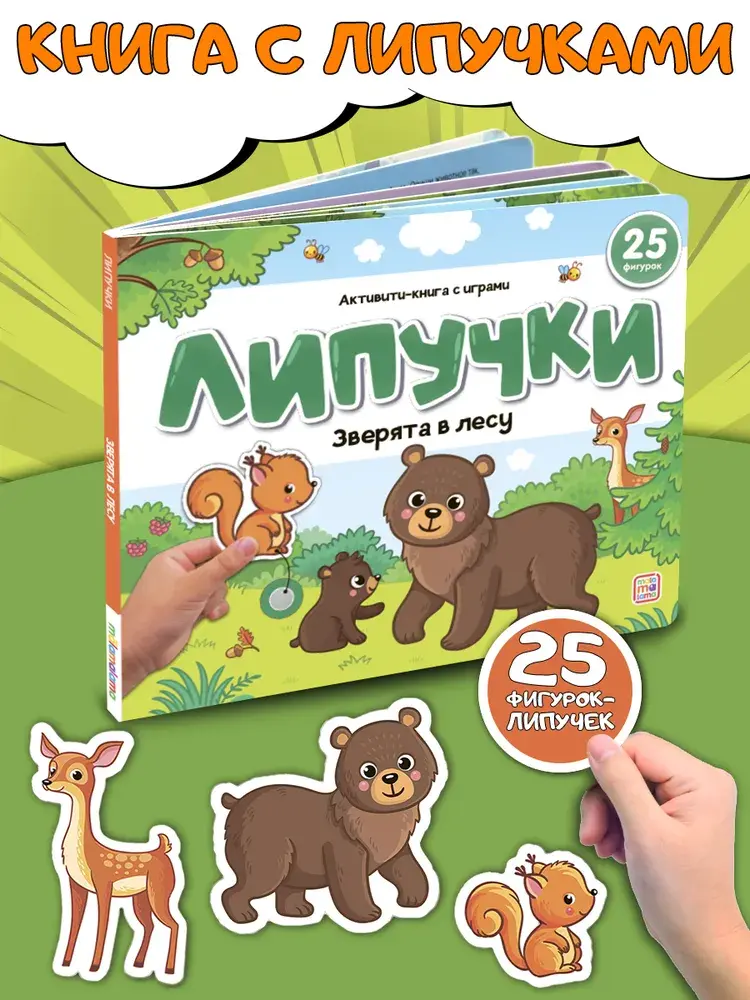 Серия «Липучки» от торговой марки Malamalama — это развивающие книги, к которым захочется возвращаться снова и снова, ведь с ними можно не только заниматься, но и играть каждый раз по-новому! Яркие фигурки на многоразовых липучках можно использовать, выполняя задания, а можно фантазировать с ними, придумывая свои истории. На страницах книги «Зверята в лесу» — знакомство с дикими животными, их детёнышами, повадками и образом жизни. А ещё на каждом развороте малыша ждут развивающие задания.Такая интерактивная игра с карточками тренирует мелкую моторику рук, сенсорные и тактильные ощущения ребенка. Её можно взять с собой в дорогу, в детский сад или же заниматься дома.Развивашка с липучками будет одинаково интересна и мальчикам и девочкам. Эта тактильная книжка – настоящая развивашка, которая поможет малышу в игровой форме развивать мелкую моторику, логику, внимание и память. Ребенок с удовольствием будет обучаться и познавать мир. Наша книжка-липучка не просто игрушка, это интерактивный инструмент для раннего развития. В каждой книге — комплект из 25 разных липучек. Собрав всю серию, вы получите 150 разных фигурок для весёлых игр игры. Учиться гораздо веселее вместе с книгами от Malamalama!