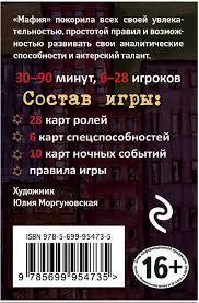 Всенародно любимая игра "Мафия" продолжает набирать обороты! К классическим правилам добавляются новые персонажи, расширяя возможности игроков, меняется роль ведущего… Мы рады представить вашему вниманию новую версию "Мафии", в которой вы сможете открыть в себе новые таланты, проявить скрытые спецспособности, побыть на стороне не только честных жителей или мафии, но и стать независимым персонажем, способным выбирать, за кого именно вы играете! Игра рассчитана на компанию от 6 до 28 игроков и рекомендована для возрастной аудитории старше 14 лет.